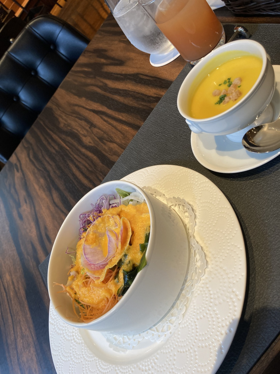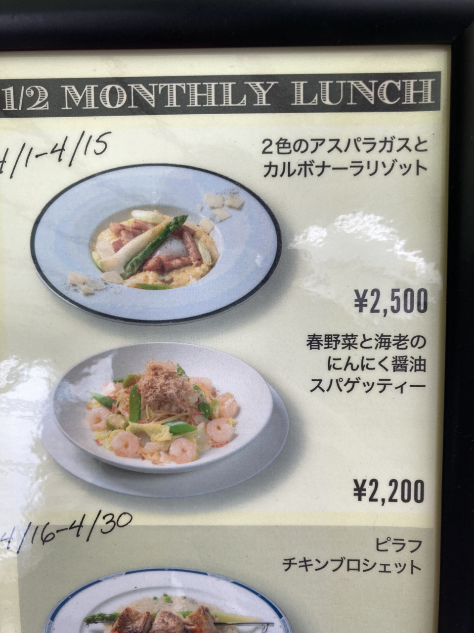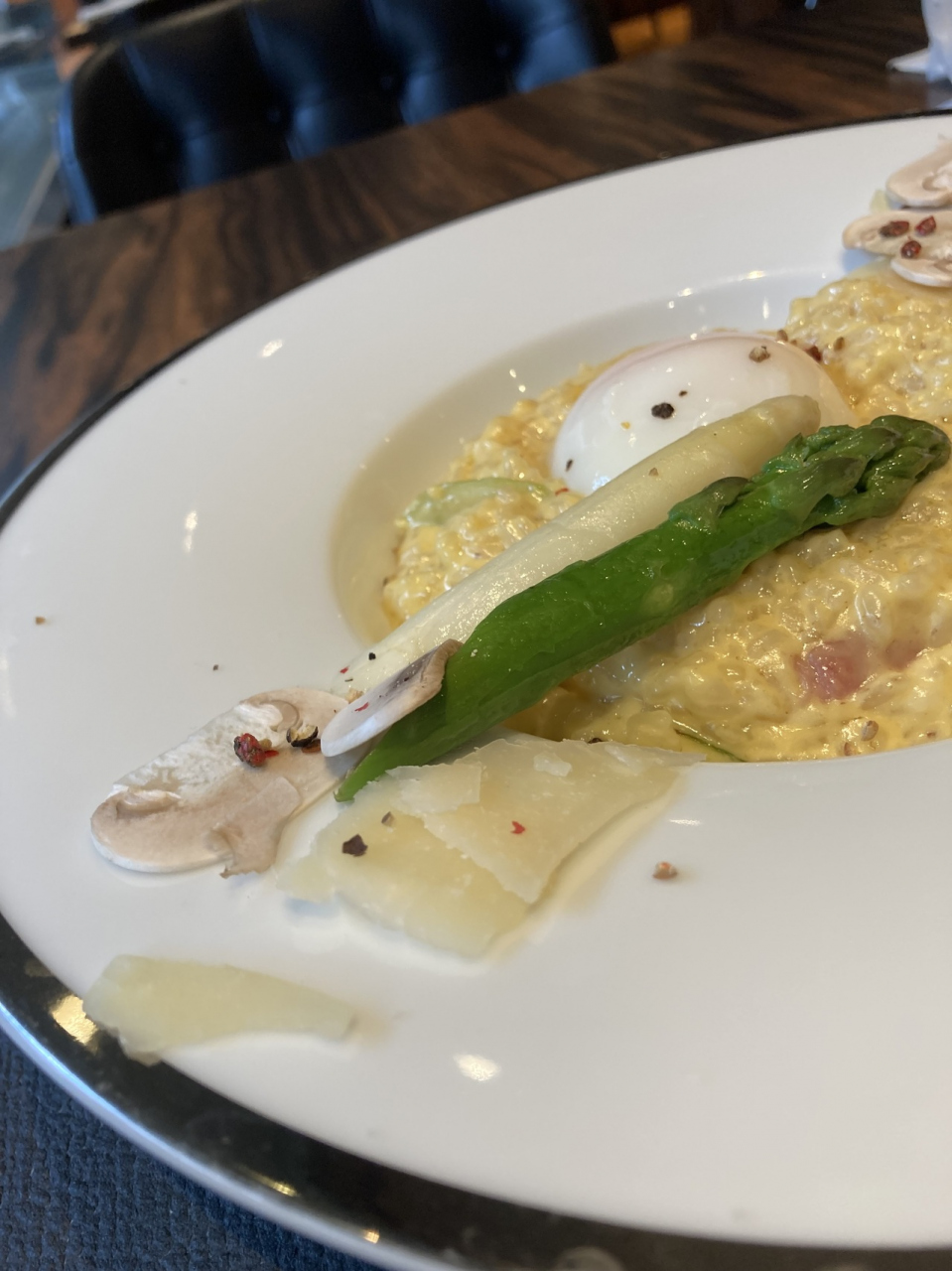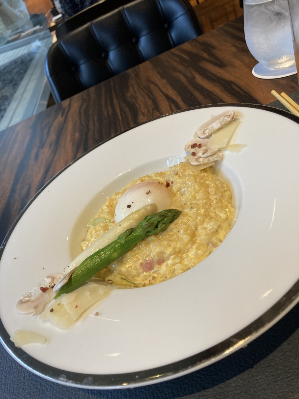 メインは二色のアスパラガスとカルボナーラリゾットそれに、サラダ、スープ、パン、フリーソフトドリンクが付いて2,500円です。