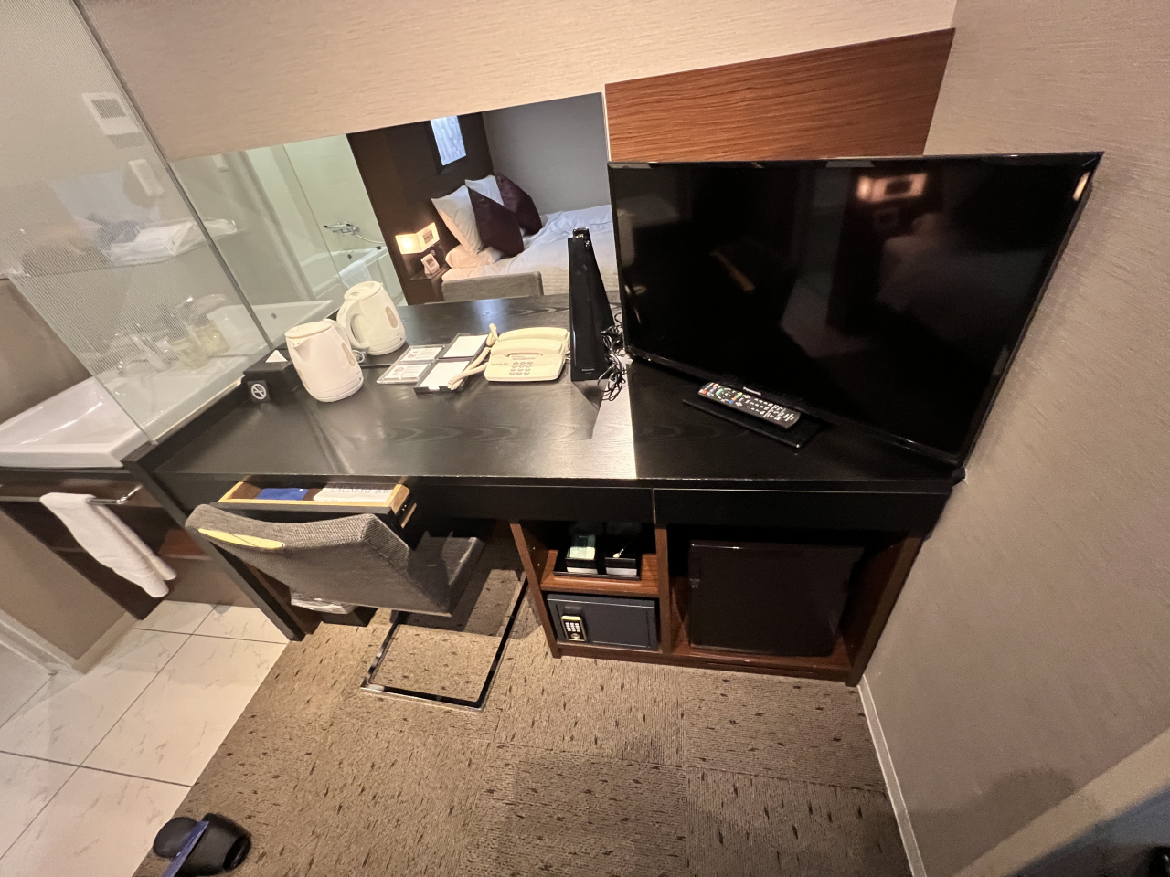コンセントはデスクに2個、枕元と洗面に1個づつ。