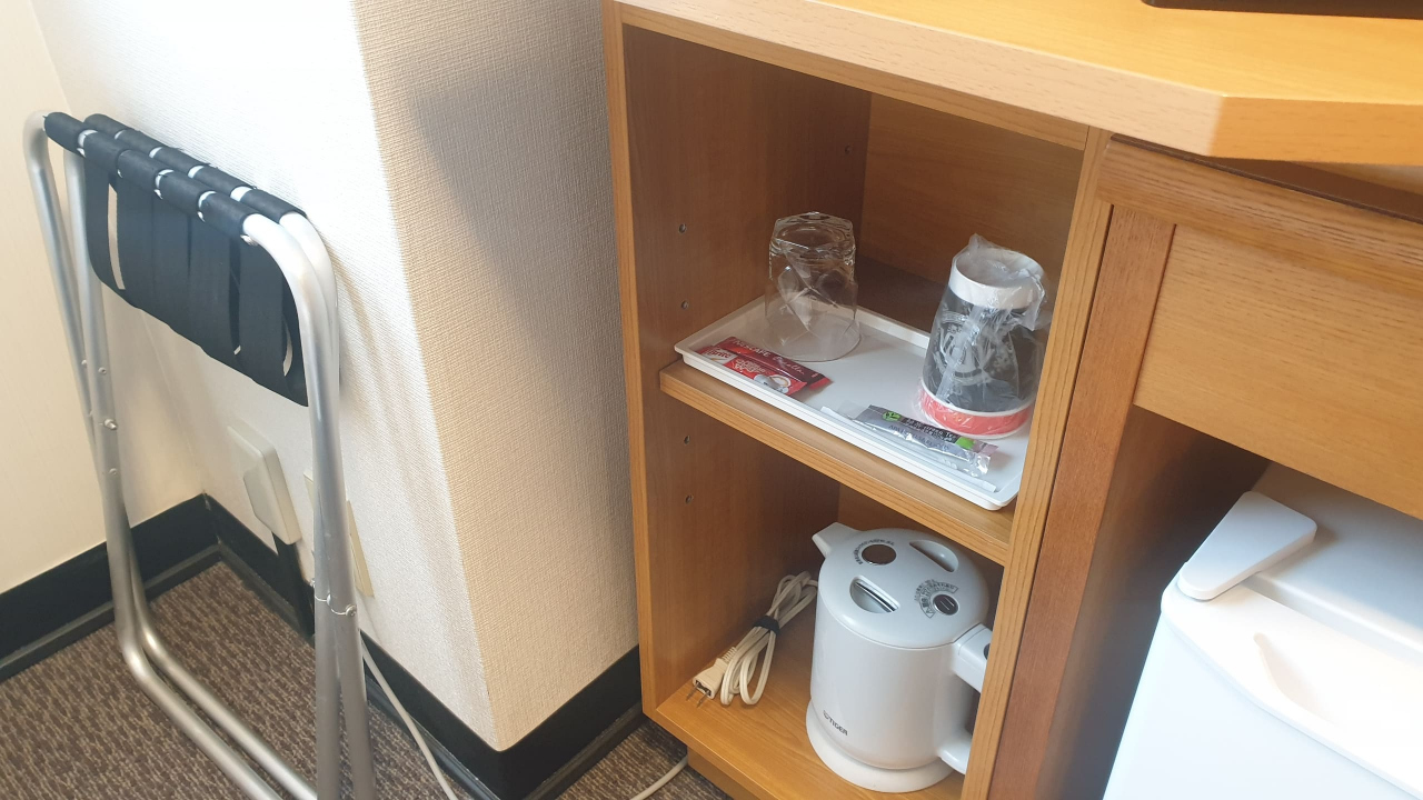 客室はやや古めのデザインという印象。スティックコーヒーとスティック抹茶。