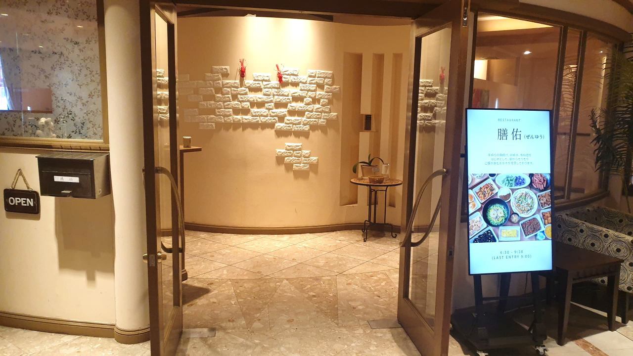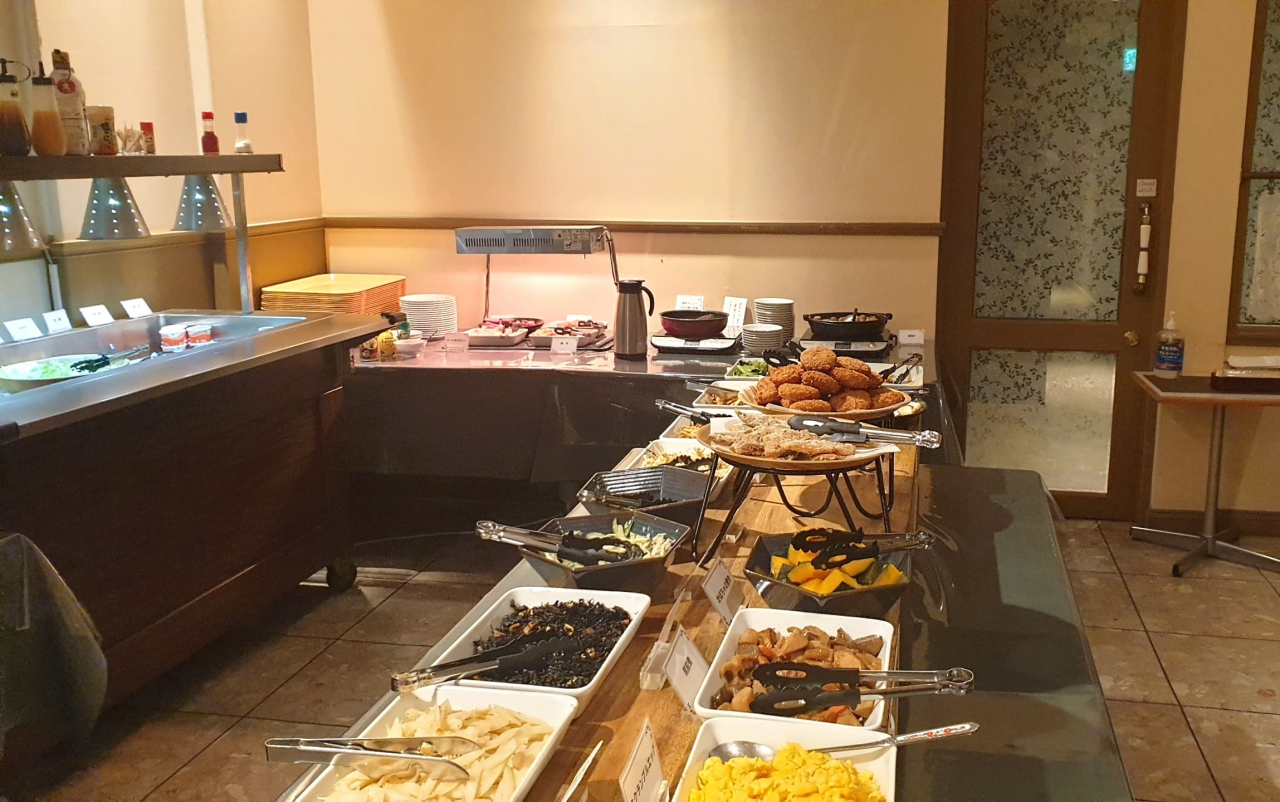 朝食は小規模バイキング。デザートは山口そよ風ヨーグルトとプリン。朝食券を購入しているとペットボトルのドリンクが1本無料でもらえた。