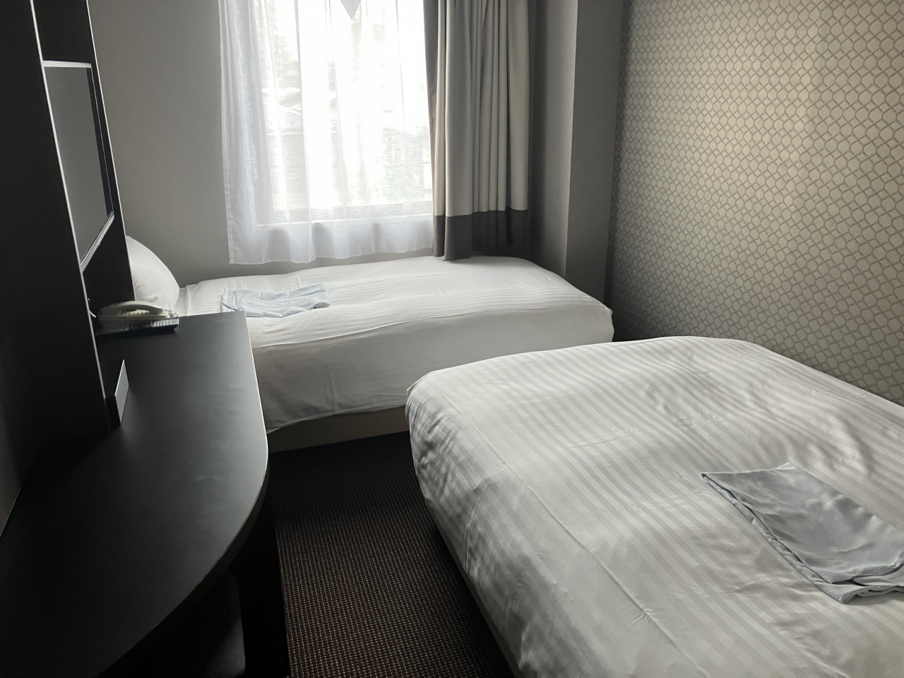 部屋はここも無理矢理ベッドを2台入れ、L字に配置しているタイプ。