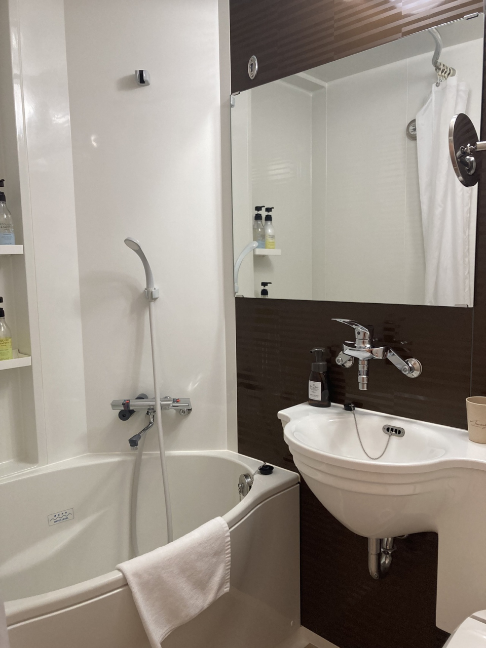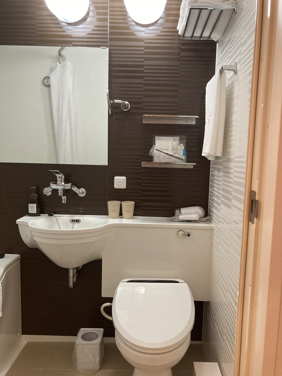 バスルームもコンパクトな作りでトイレは標準サイズよりちょっと小さめ。洗面台もかなりコンパクトだか洗顔、歯磨きには問題なし。