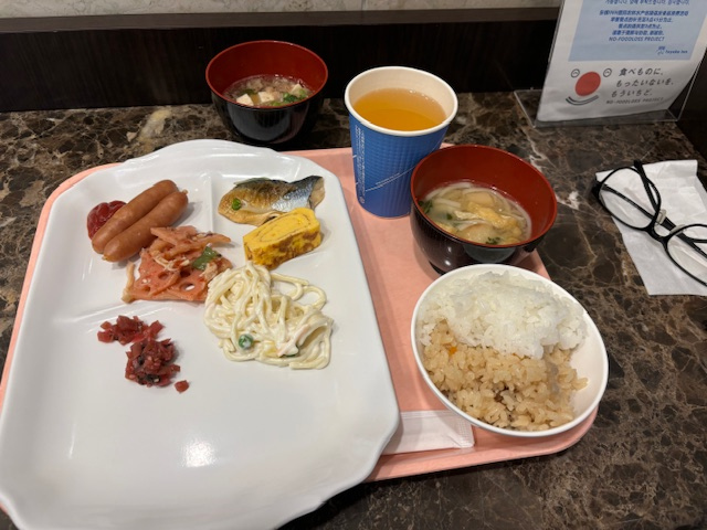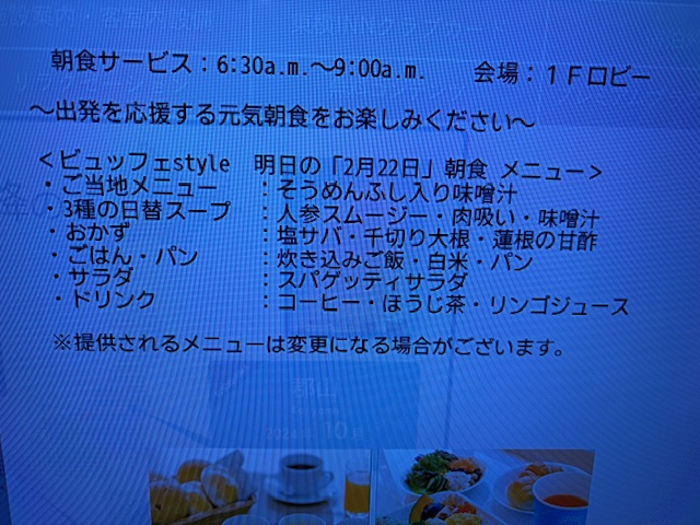 朝食には、ご当地メニュー・そうめん入りみそ汁があった、他はほとんど冷凍業務用だが無料なのでありがたい。
