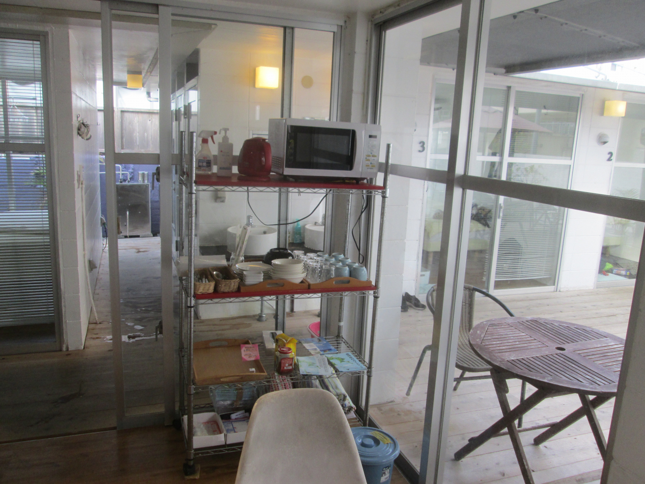 慶良間諸島ツーリストロッジ ハナムロ イン 阿嘉島のキッチンは宿泊者の共用施設になっていました。コンロと電気ポットがあり、棚の中にはお皿などの食器類がありました。インスタントですが、コーヒー、お茶セットもあり自由に飲むことができました。