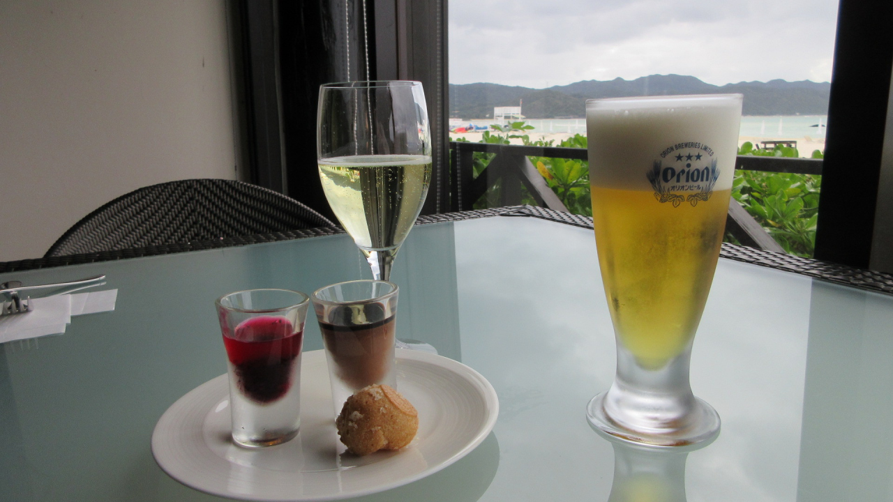 1) ビーチフロントにある「潮風のラウンジ」の利用。ソフトドリンク、スイーツは勿論、(時間帯によって)酒類(オリオン生ビール、ワイン、泡盛etc.)、前菜もある