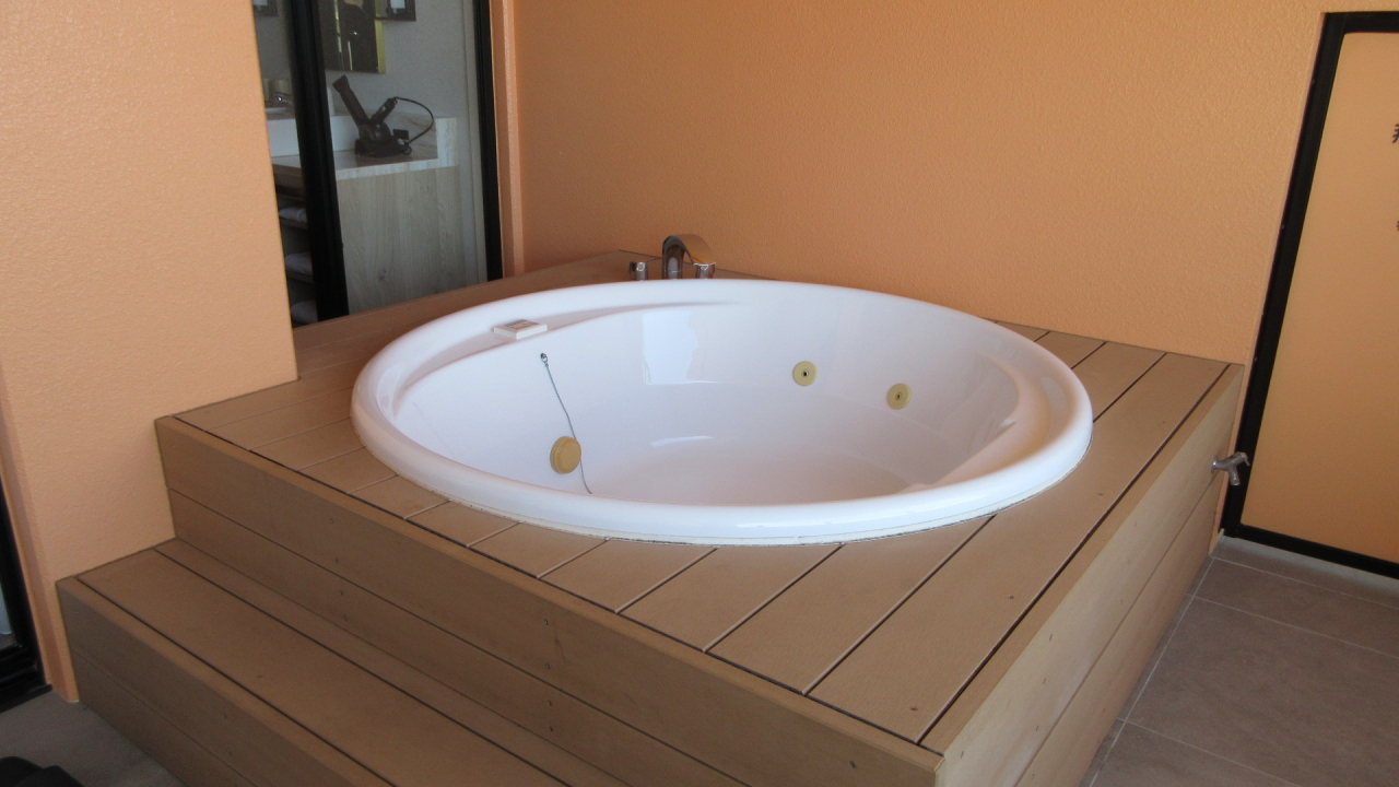 一番の売りはジェットバス。デイベッド(2台)もあるバルコニーは広い(18.3㎡)。日本旅館で言えば、露天風呂付客室みたいなもの。人目を気にせず入れると、家人はいたく気に入った様子。