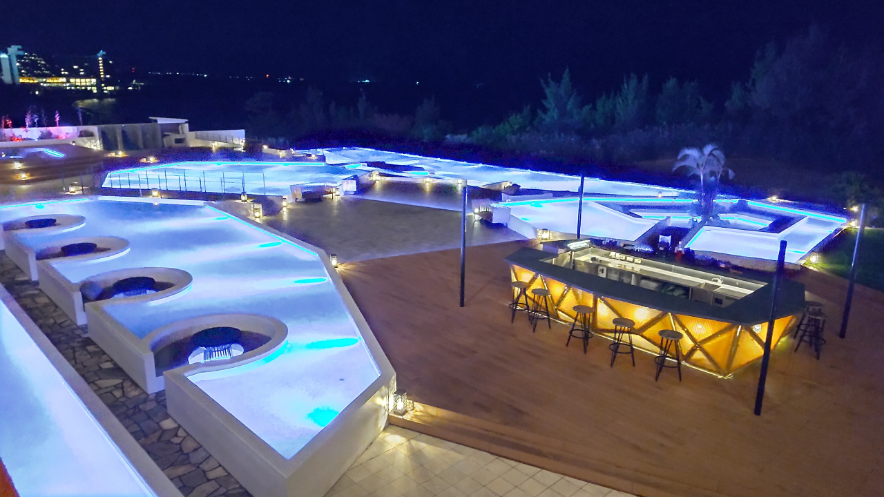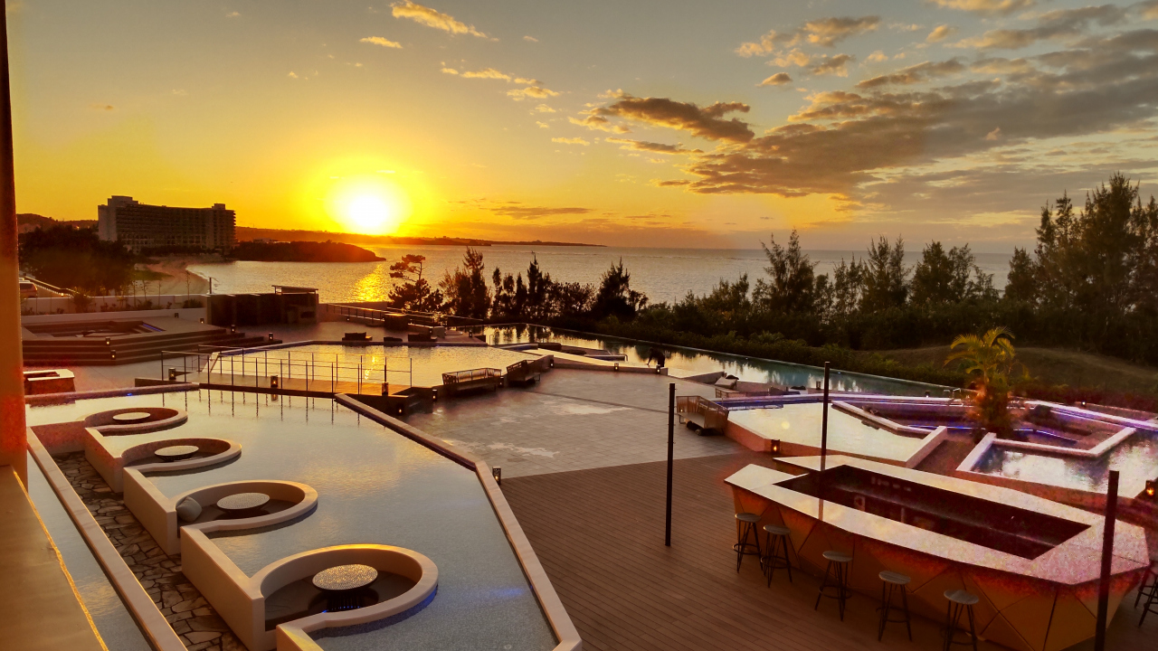 ロビー前の屋外には大小様々なプールやガゼボ、オープンエアバーを配した「AQUA TERRACE」があり、プール越しに見る夕日は美しい。夜間、水中照明でライトアップされたプールも幻想的で、フリーフローで提供されるホットワインやホットウイスキーを飲みながら眺める、というのも乙なもの。