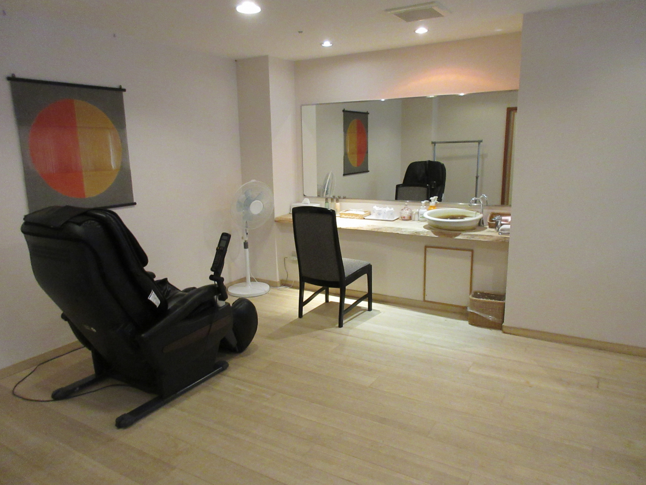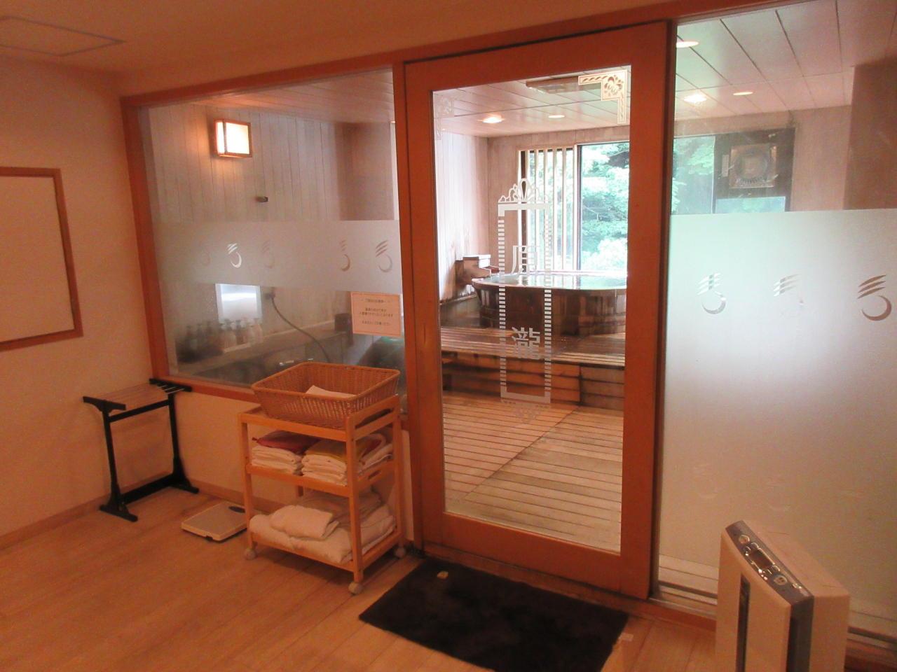 玄関横の扉を開けると、ビックリ仰天、大浴場のような広い脱衣所があるじゃないですか。さらに奥にはこれもおおきな源泉かけ流しの木のお風呂。ここは、かつての2部屋だったのをリニューアルして、一方を専用のお風呂に改装したのですね。マッサージチェアや扇風機があるし、シンクは広いし、ゆとり度満点です。後で入った貸切風呂と同じくらいの広さです。