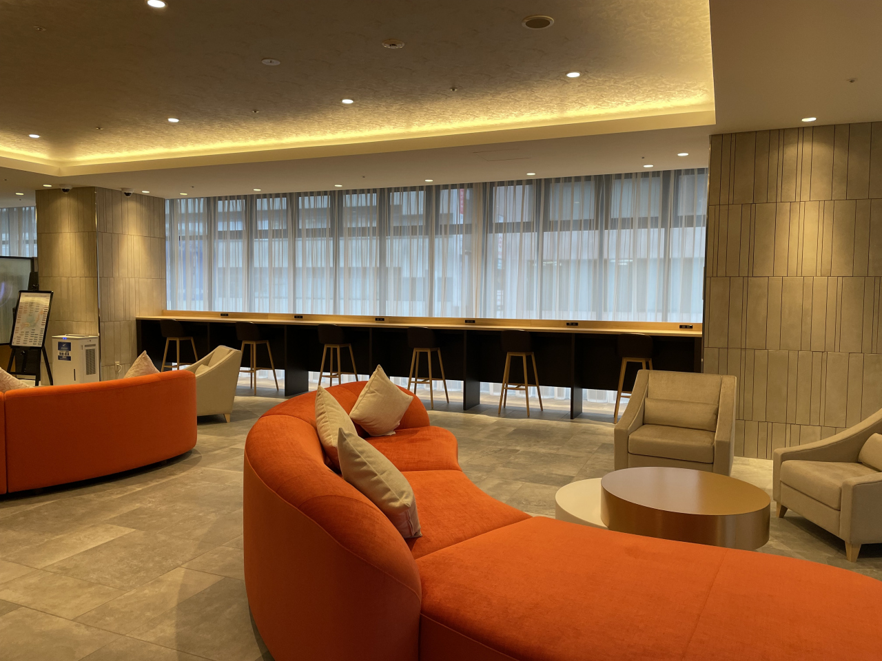 ロビーは壁一面に窓を設けた開放的な空間、アメニティバーも用意。