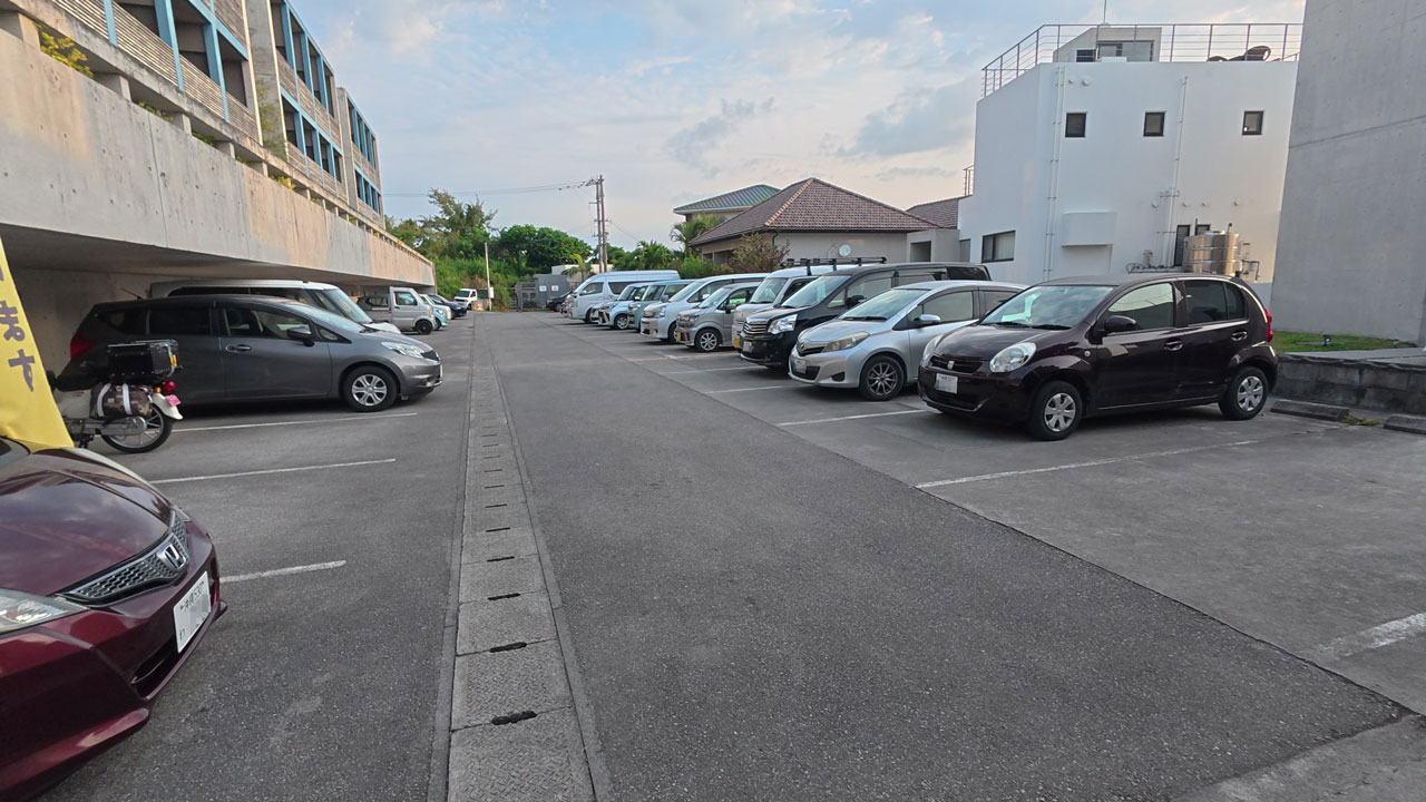 駐車場区画に停めます。
