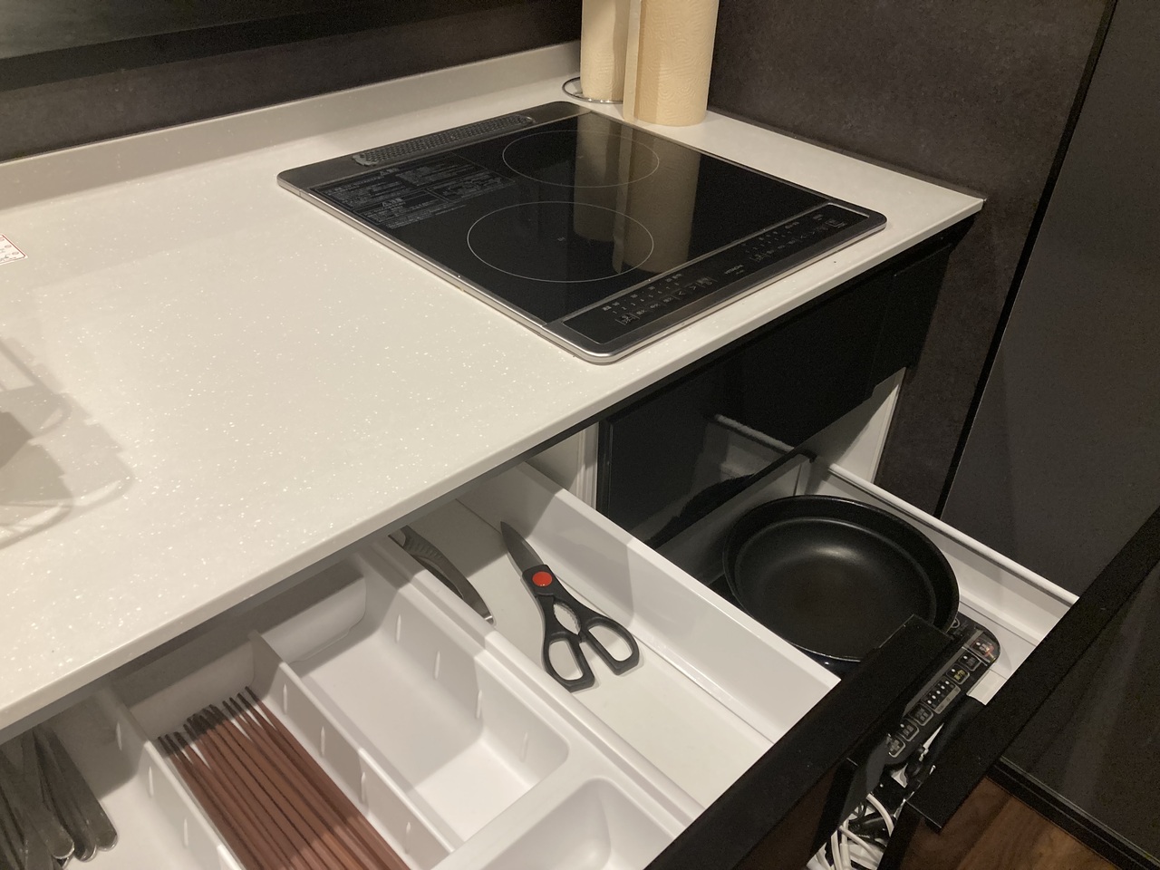 キッチンには大きな冷蔵庫と8人分の食器&調理器具が備わっています。