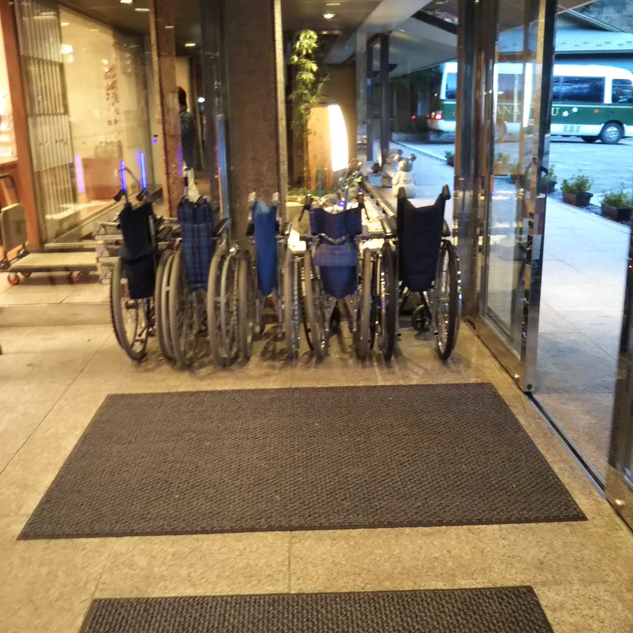 こちらの華の湯も以前宿泊したことがありますが、大型のホテルです。 今回も部屋は和室でしたが、洋室の部屋もあるようです。 玄関に車イスがおいてあり、自由に使えることだったので、次回は母を連れて行こうと思いました。 確かにホテル内は広くて温泉、食事、部屋移動するのに車イスがあると助かると思いました。
