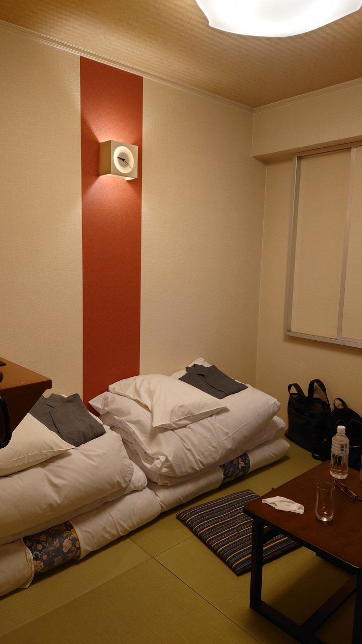 札幌で所用があったが、千歳に着くのが遅かったので近くにホテルを取りたかった。が、どけにも空室がない。だけでなく凄く高い。数日前も違うホテルに予約した時はもっといい部屋がずっと安かった。何でこんな事がと調べたらどこのホテルも同じ様でその日は何倍にもなっていた。札幌で大きなコンサートがあるとか。そういうものなんだなと思い仕方なくやっと取れた部屋に宿泊。ここは千歳駅から歩いて10分弱。周りにあまり飲食店はない。イオンにも歩いて行けるが、遅かったので無理。コンビニが途中にあった。部屋は何とも不思議な部屋で四畳半位の狭い畳の部屋に布団を敷いて寝るようになっている。子供が小さい親子とか意外にいいかも。ですが、高齢の私には布団敷きは厳しい。こういう形状の部屋も珍しい。しかし、畳も部屋も大変キレイで良かった。その他は普通のビジネスホテルと変わりはない。もちろん、普通のベッドのへやもあります。当日はその和室しか空いてなかった。フロントもキレイだしいたって親切。朝千歳空港には無料で送迎もあるそうで便利です。ホテルはできるだけ早く予約しましょう
