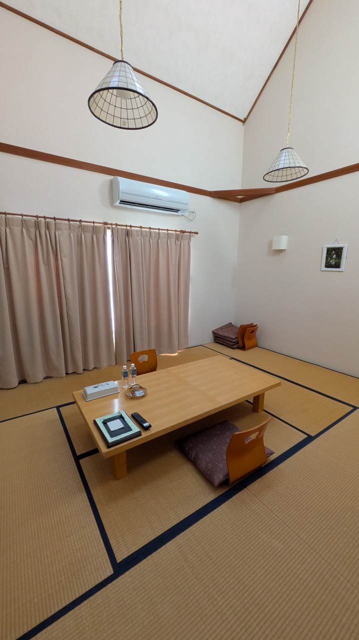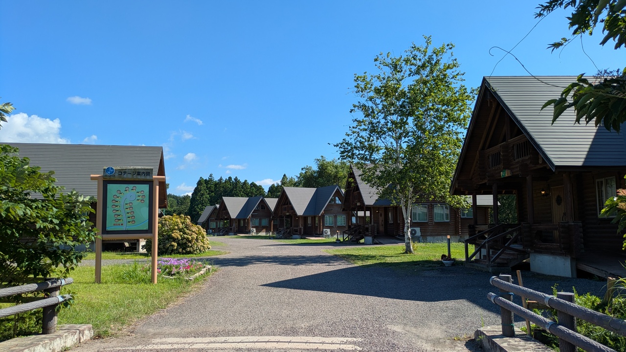 海岸沿いの道から十二湖へ向かう途中の森の中にある宿泊施設です。戸建てのコテージと長屋型の和室棟がありますが、今回は和室棟に泊まりました。ロフトはありますが、キッチンやダイニングはないので、部屋の広い旅館に近い使い勝手です。お風呂と食事は別棟にあります。