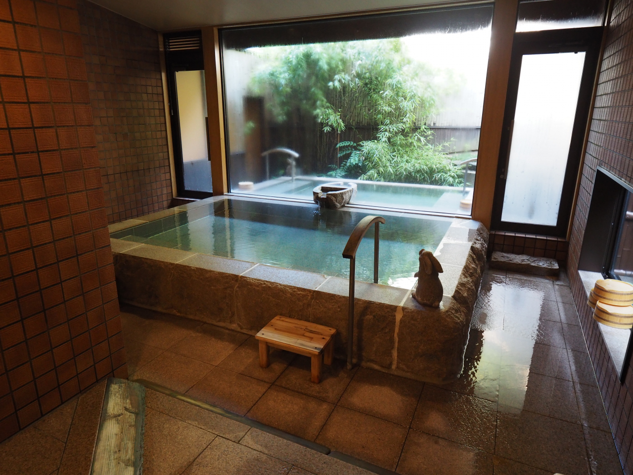 部屋は2階の和室10畳+広縁付き。特に豪華さはありませんが、掃除も行き届き落ち着く部屋でした。浴室は男女別の内湯と露店風呂が各1つずつ。3階に予約不要の貸し切り風呂があります。ナトリウム・カルシウム - 硝酸塩温泉の湯が源泉かけ流し。肌当りがやさしい、少しツルすべ感がありいいお湯です。