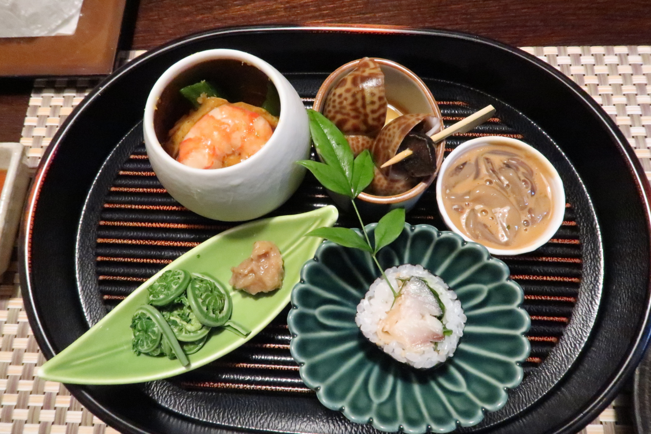 ●前菜(夏野菜と魚介の旨出汁ジュレ、黒バイ貝旨煮など)
