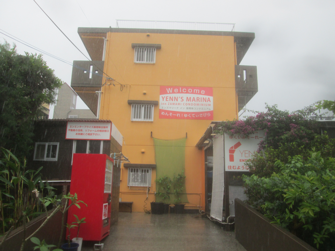 エンズ マリーナ イン 座間味 コンドミニアムのチェックインは15時で、12時過ぎにホテルに到着すると、部屋が利用可能だということで、アーリーチェックインができました。外観は3階建ての団地のようで部屋は1LDKの間取りのようでした。
