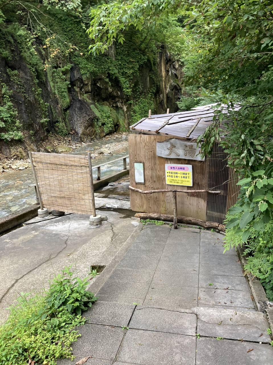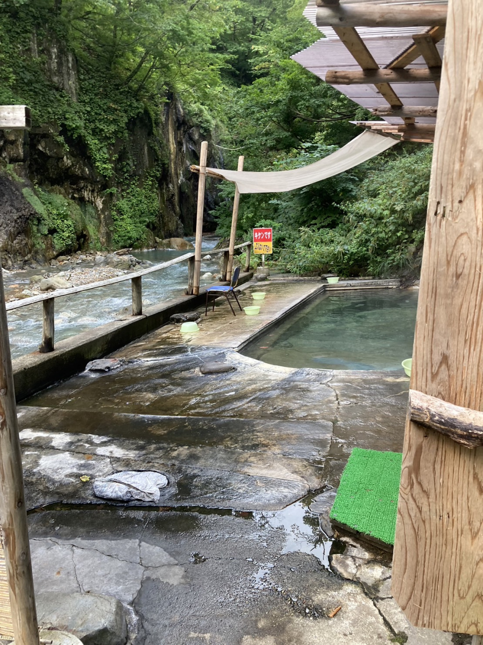 熱いけど 階段を下って湯に入る。川を眺めながらの気分がいい。