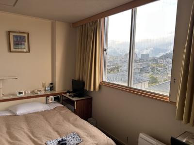 本当はロータリーにあるホテルに泊まりたかったのですが、満室でこちらを予約しました。ヤフートラベルで予約時ポイント即時利用で5610円。十分です。シングルに空きがなくダブルにしましたが、シングルで取れたらもっと安かったと思います。ホテルに着いたら自転車が数台あったので聞いてみたら、レンタル無料とのこと。到着が17時過ぎていたので、ここから日が暮れるまでの観光、かなりこの自転車のおかげで観光ができました。お盆の利用でしたが、食事箇所が少なくて結局スーパーで買いました。