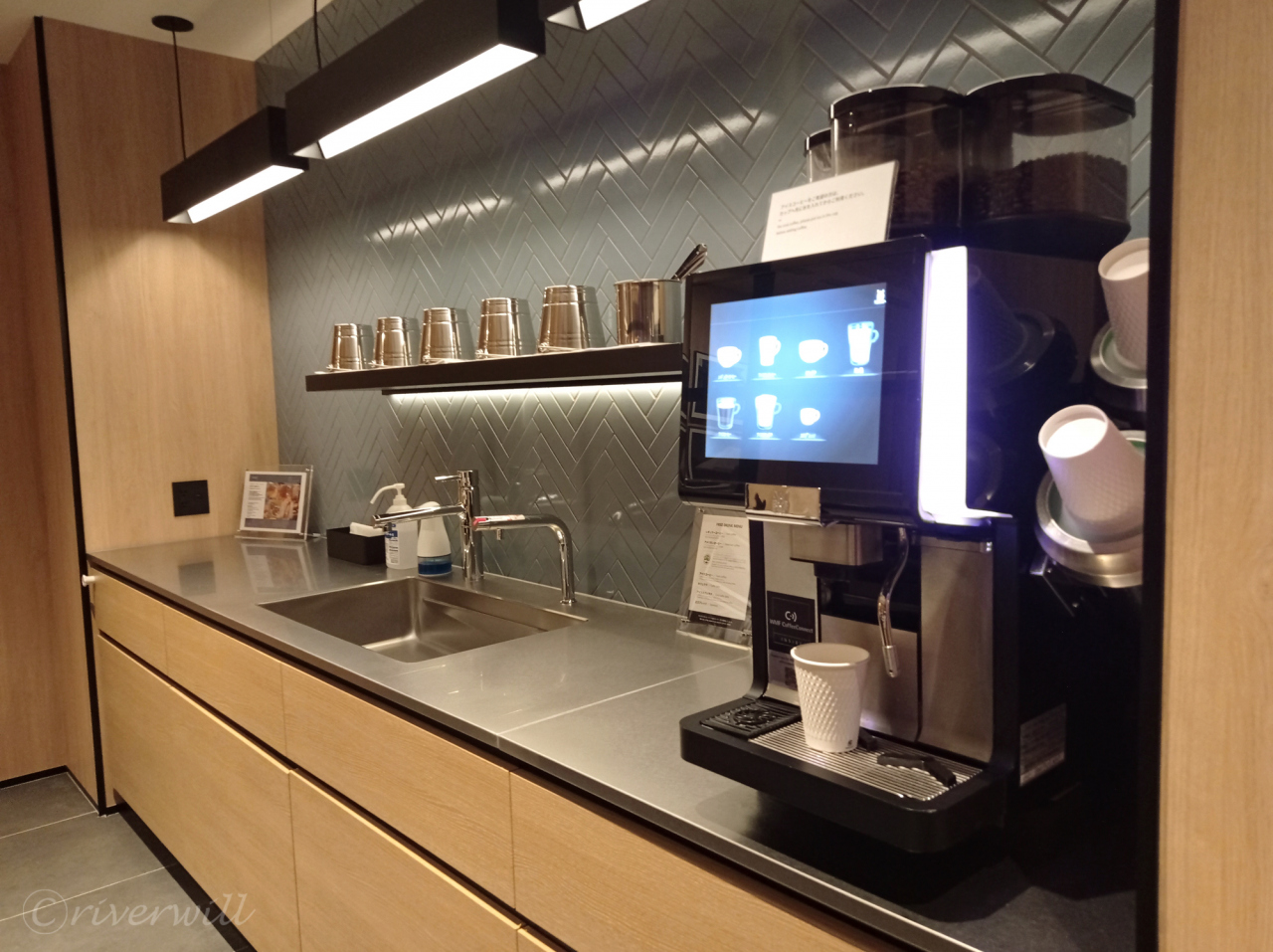 飲み放題の挽きたてコーヒーマシン、レトルトのフリードリンク(味噌汁や緑茶、紅茶など)があります