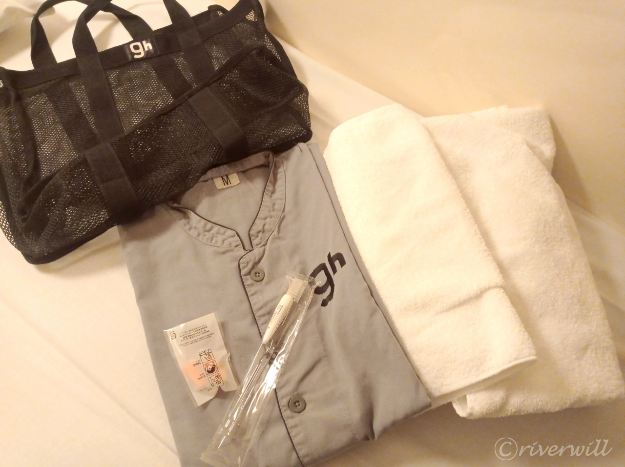 パジャマ、タオル、歯ブラシ等がセットになって提供されます
