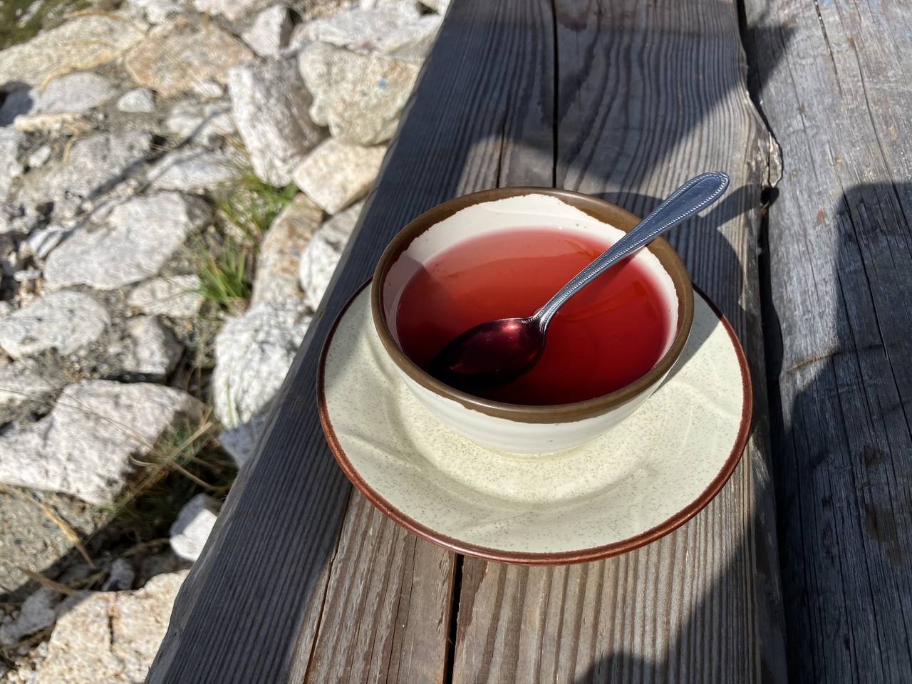 裏銀座の稜線上にある青い屋根が特徴の山小屋です。売店があり、ジュースや手拭いなどを販売しています。今年は寒天と缶詰みかんで作ったゼリーにぶどうジュースがかかったゼリーを600円ではんばいしていて、さっぱりしていて美味しかったです。ちゃんとした食器で出されるのも良かったです。小屋前にはベンチがあり、通過者も座れます。