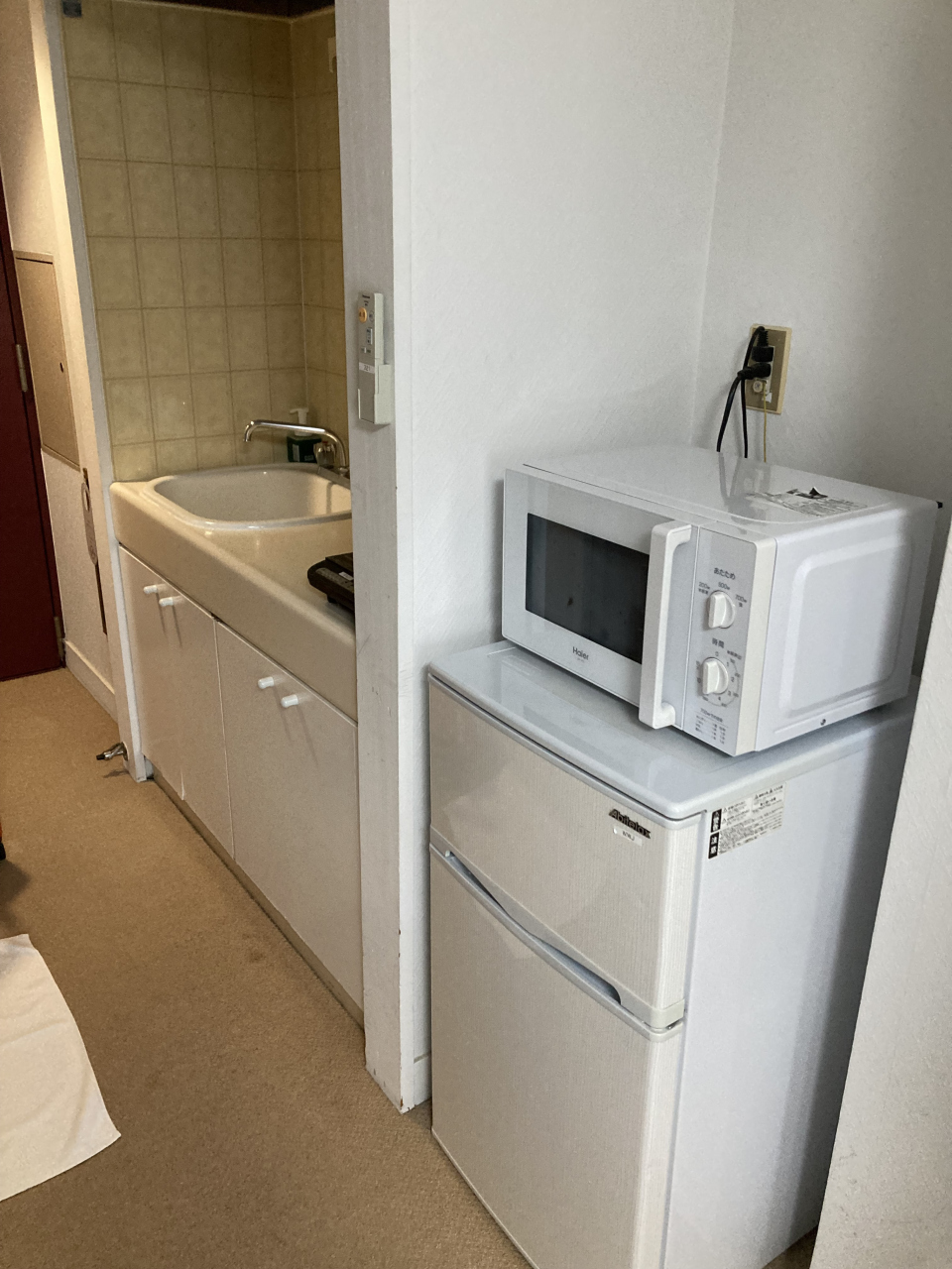 部屋はマンションの1室みたいな作りです。冷凍庫つき冷蔵庫、電子レンジ、電磁調理器