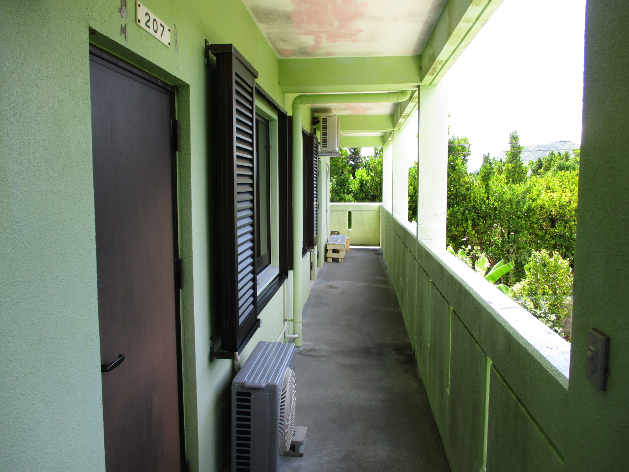 通常、日本のホテルや民宿のチェックインは15時か16時ですが、民宿 ムラナカは12時過ぎに到着すると、部屋が利用可能だということで、アーリーチェックインができました。外観は2階建ての団地のようで部屋は1Kの間取りのようでした。