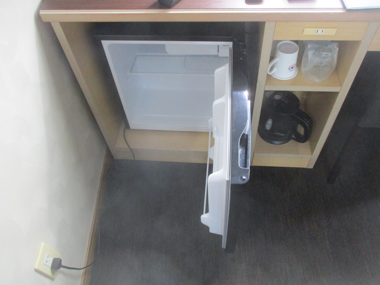 エコノミーホテルに冷蔵庫が付いていないことがありますが、こちらのホテルにはミニ冷蔵庫が設置されていました。中身は空で自分で持ってきたマイドリンクを冷やすことができました。12月の宮古島は蒸し暑く、ホテルに戻ってから冷やしておいたドリンクを飲めたのはありがたかったです。