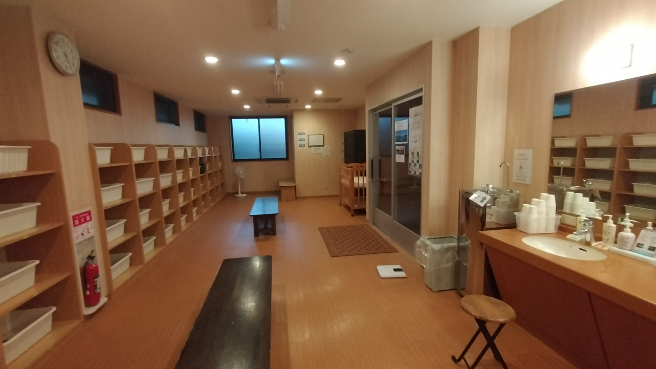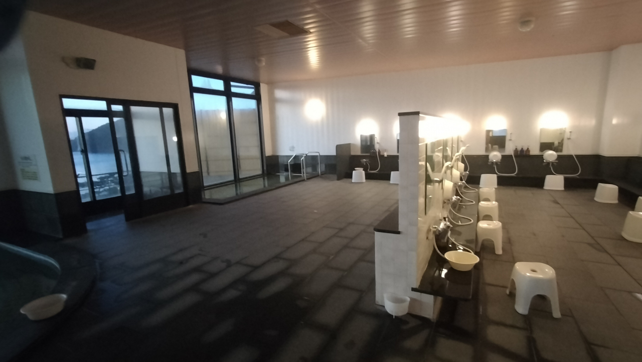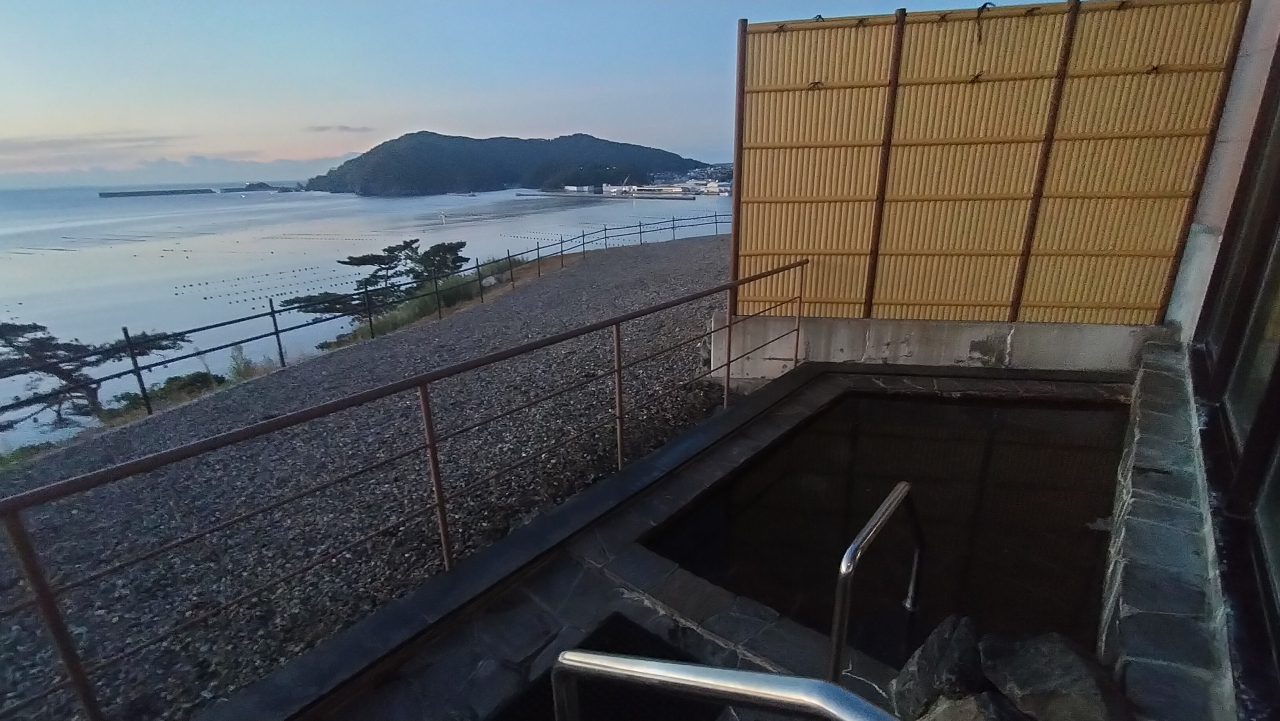 お風呂からも海が見え眺めがよいですが、露天風呂があまり広くないので混雑すると不便な気がします。日帰り入浴もあり、夕方早い時間はそこそこ入浴客がいました。日の出の時刻が掲示されていますが、東側に半島があるので冬の時期以外は、太陽が見えるまで1時間ほどかかるようです。
