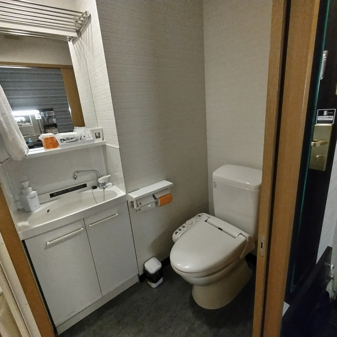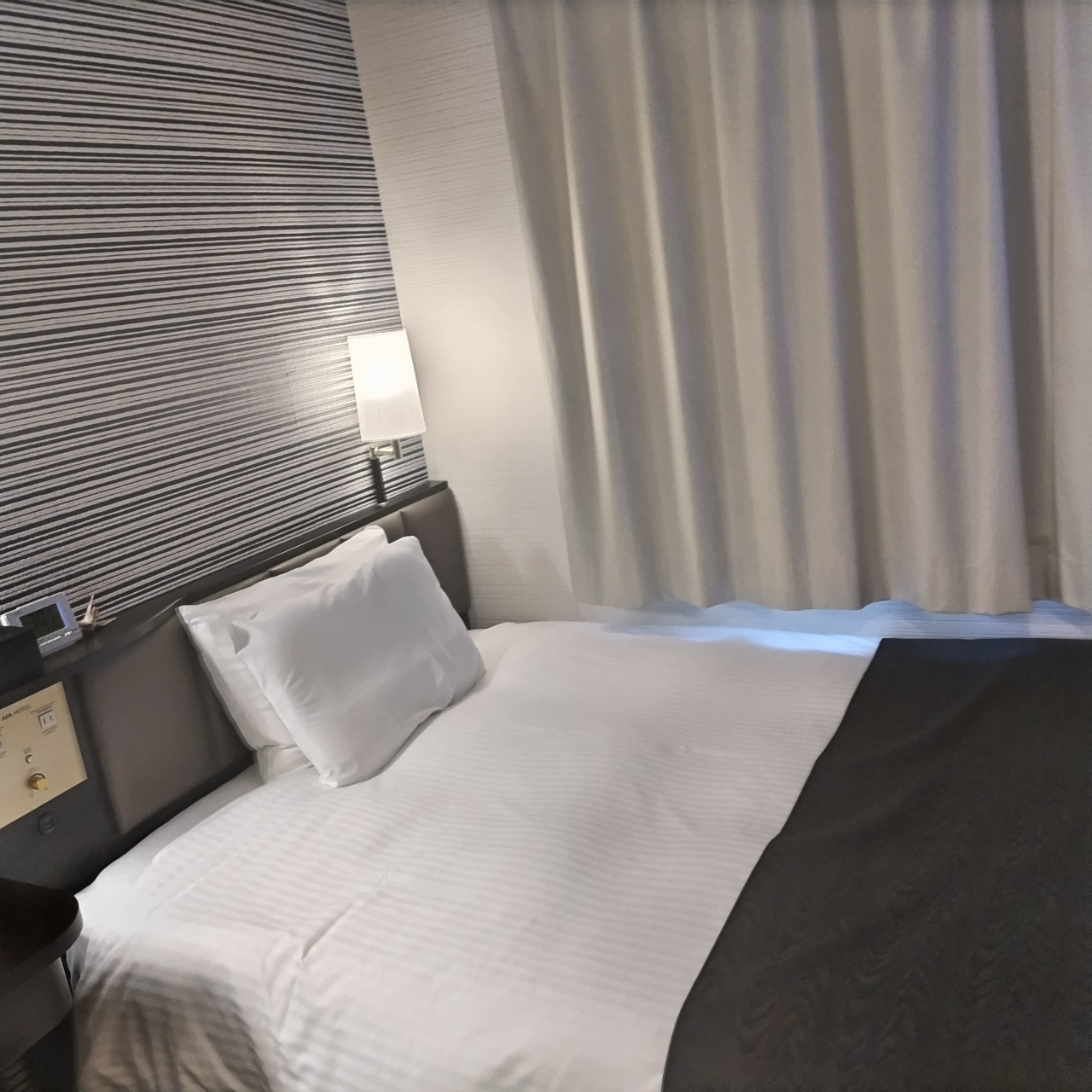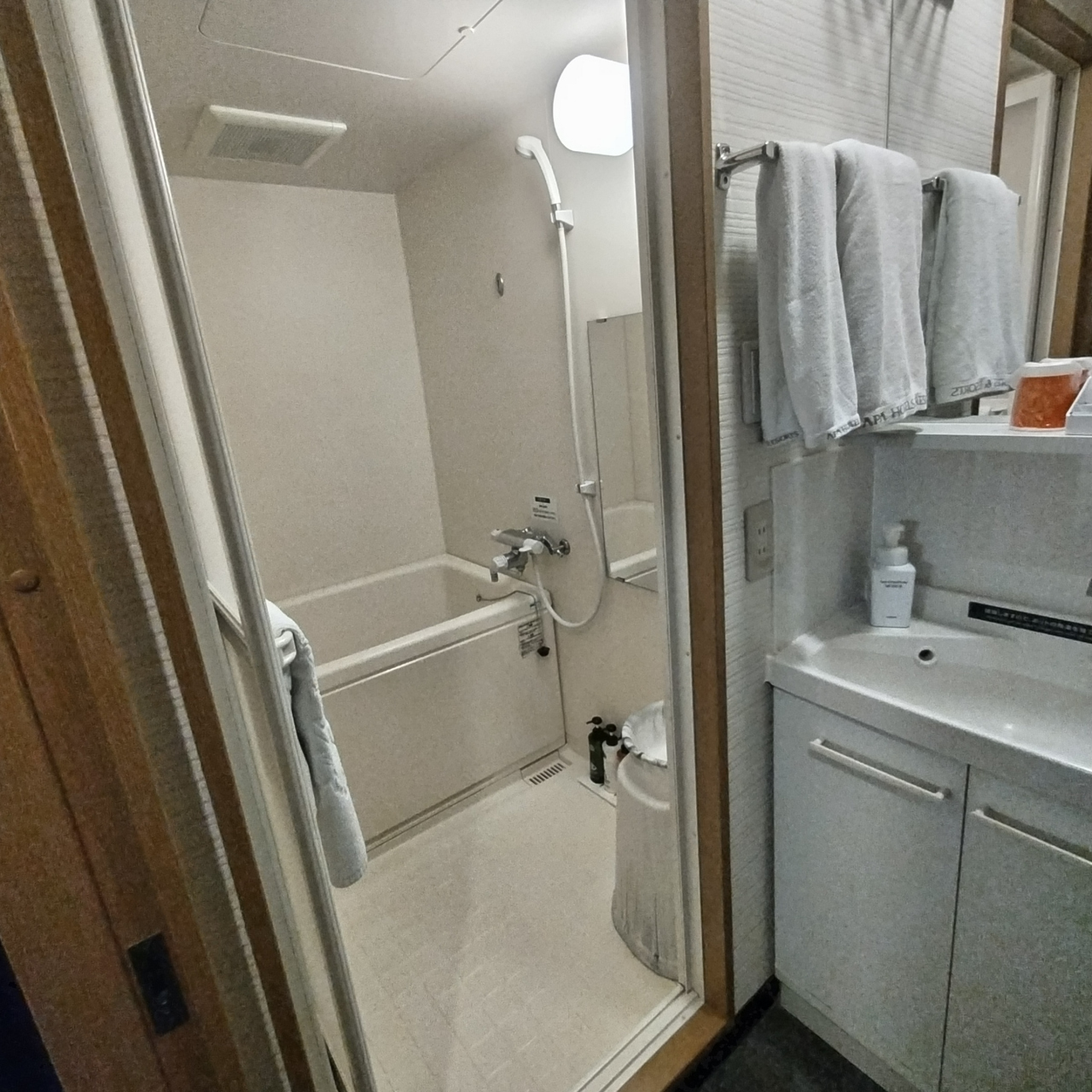 建物は新しくありませんが、内装などはアパホテルブランドのものできれいになっています。バスルームとトイレが独立したものですが、バスルームが広くないため湯船が狭く、シャワーを浴びるだけになるかと思います。