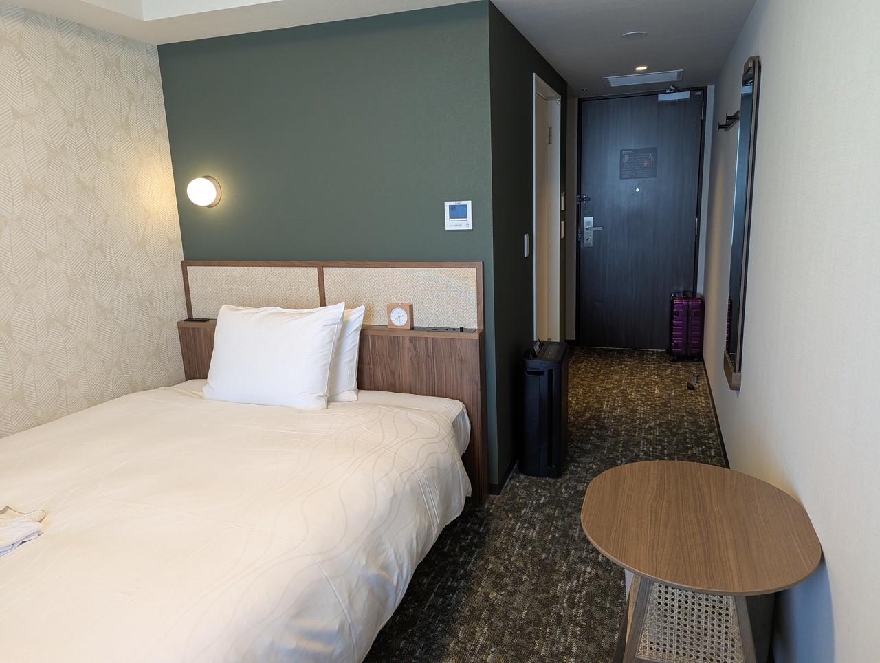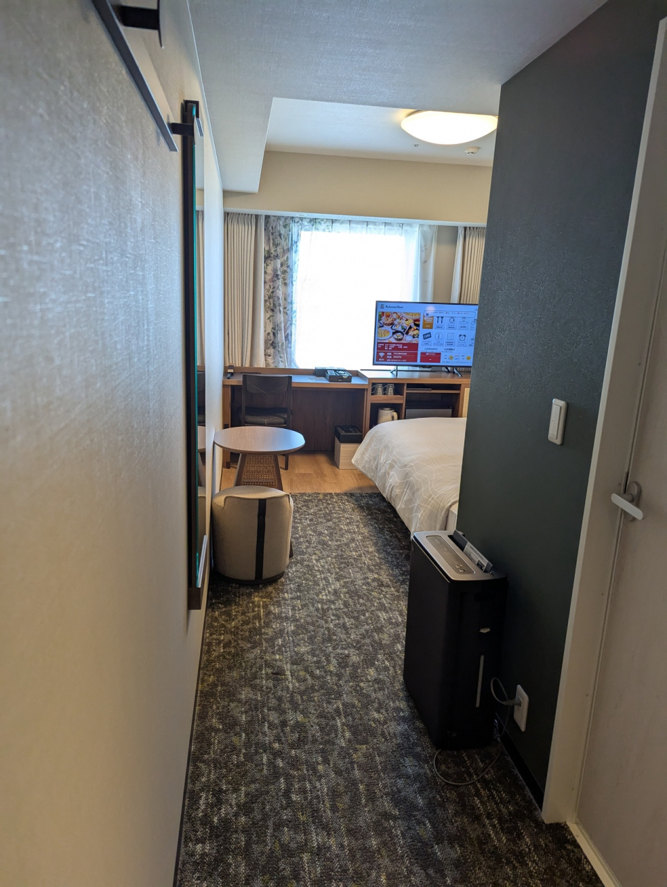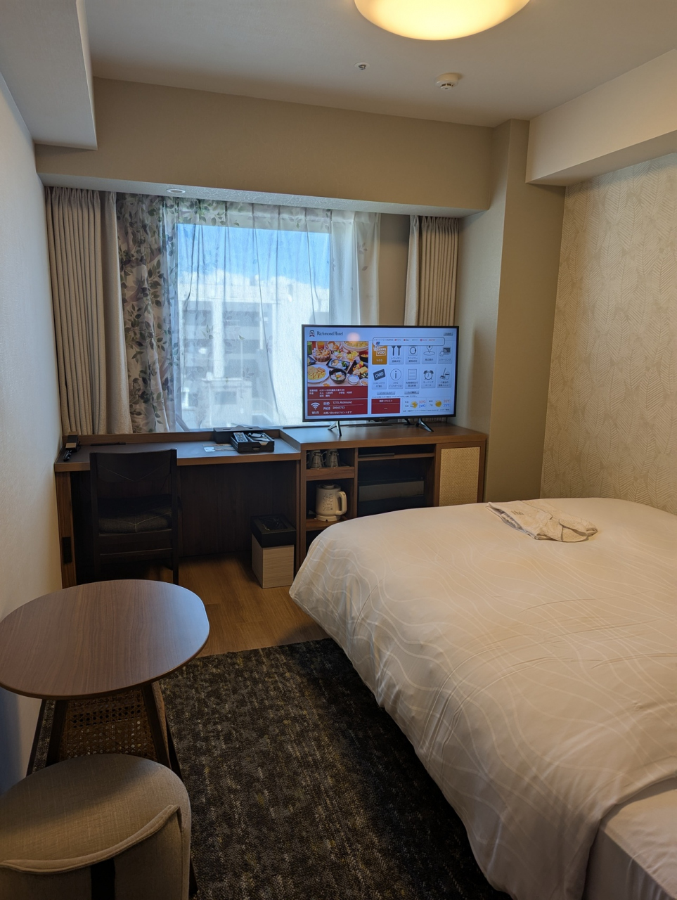 部屋は落ち着いた雰囲気かつ明るく広いです。バゲージラックでスーツケースを広げても干渉しないくらいゆとりがあります。ベッドも広いです。窓側にデスクがあり部屋で仕事も出来ます。
