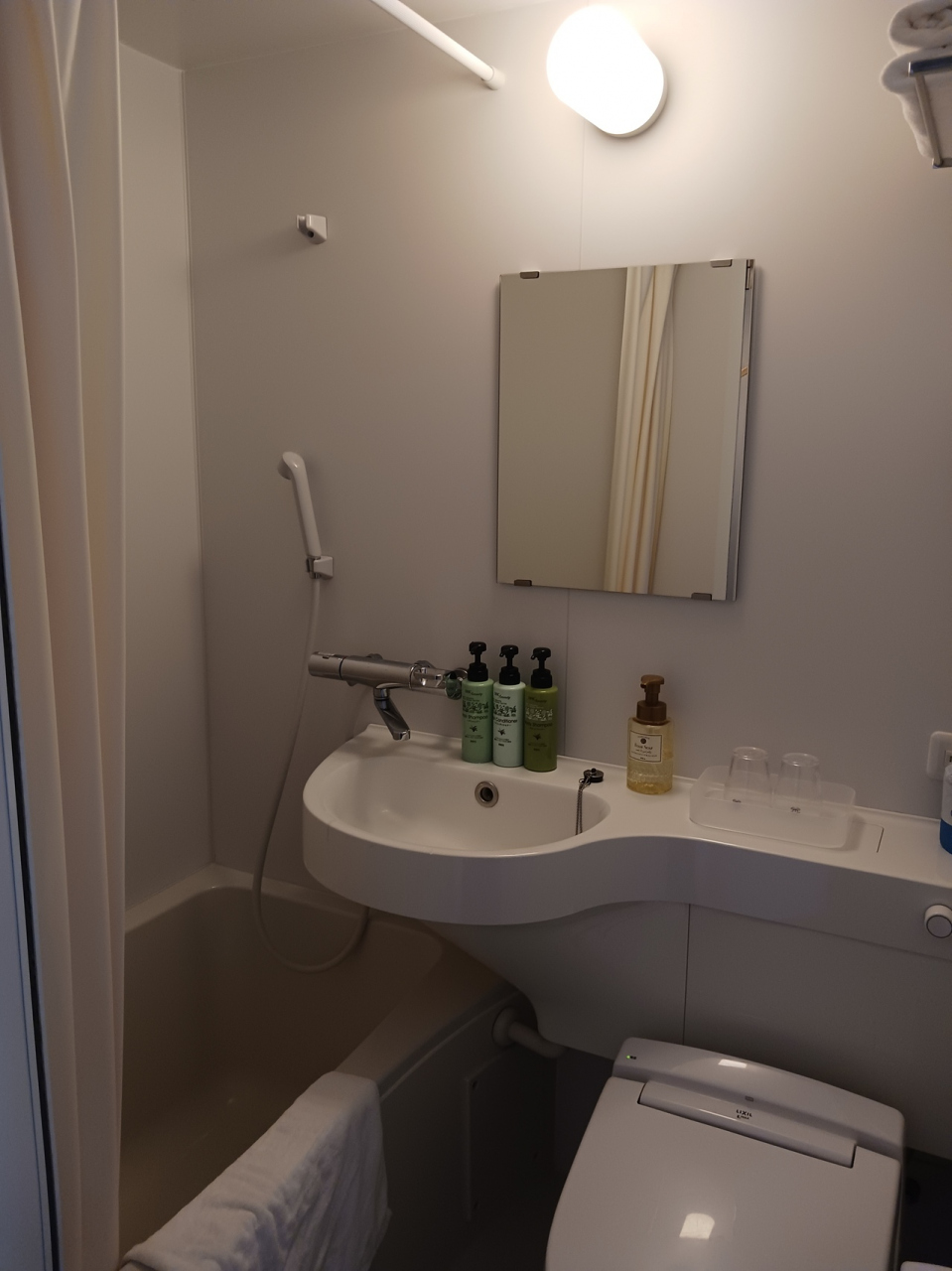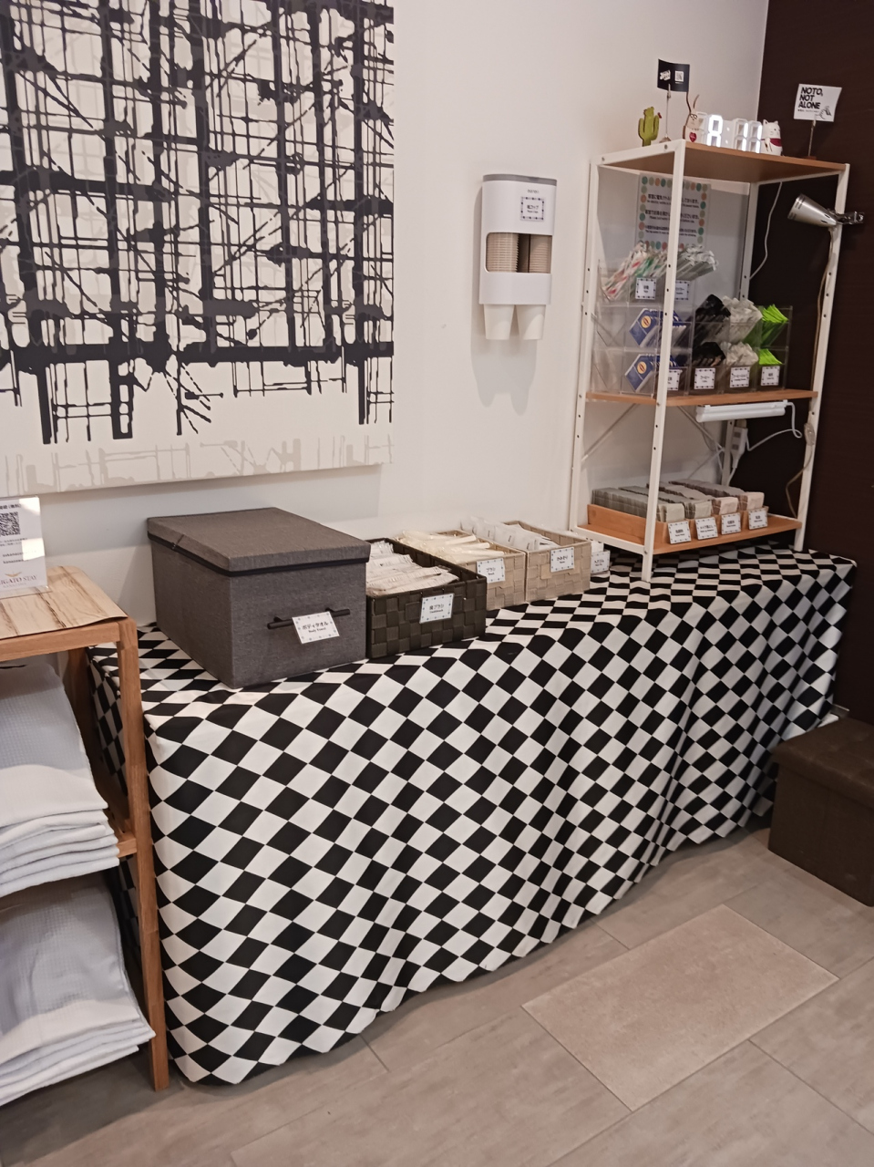 ロビーで館内着、アメニティ(化粧水や歯ブラシなど)、スティックコーヒーやお茶、飲み物用紙コップを受け取り部屋に移動。
