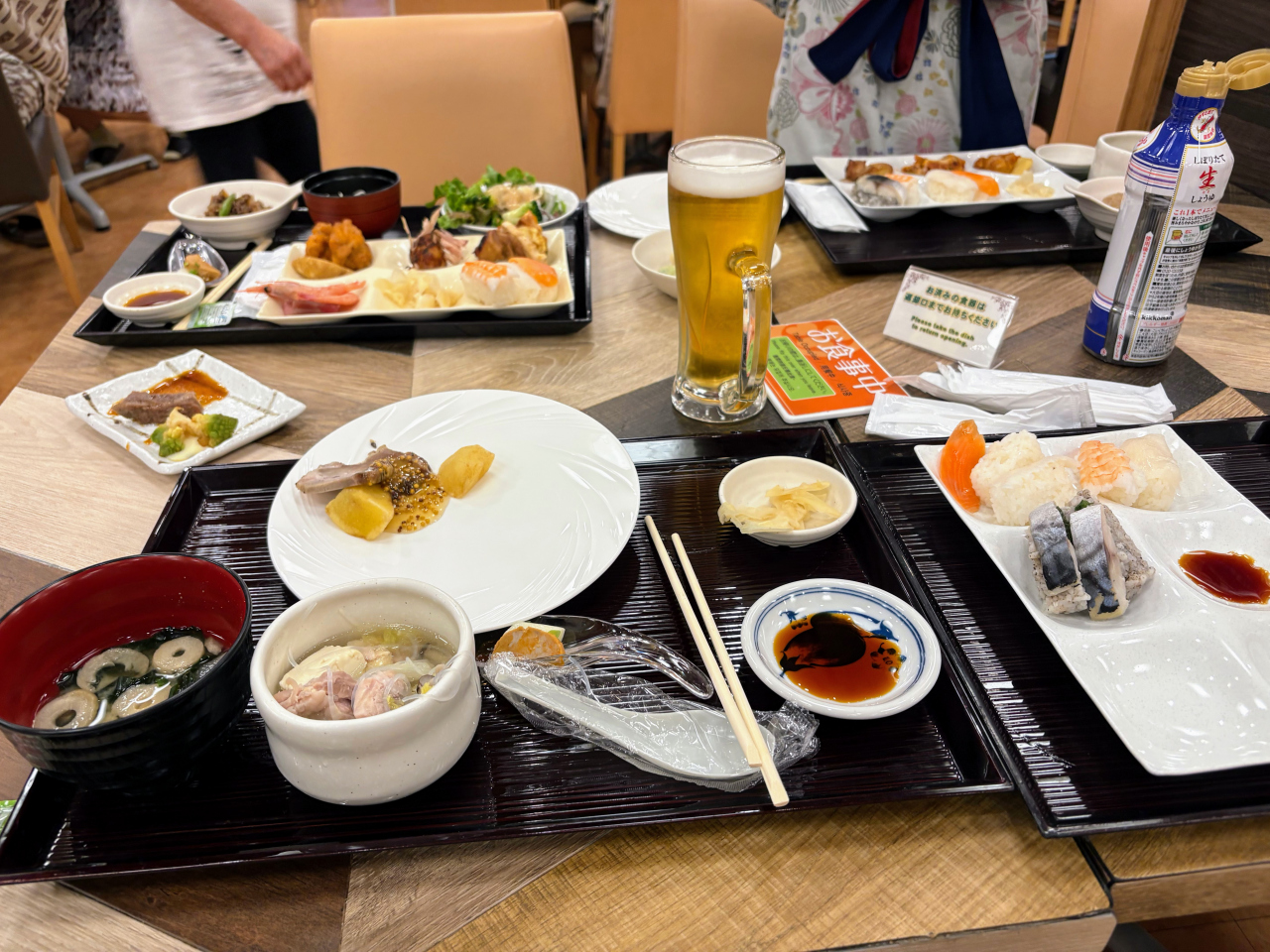 食事は何時ものバイキングなので不足はありませんでしたが、握り寿司の種類が少なく残念でしたが、水炊きとほうとう鍋は美味しかったです。