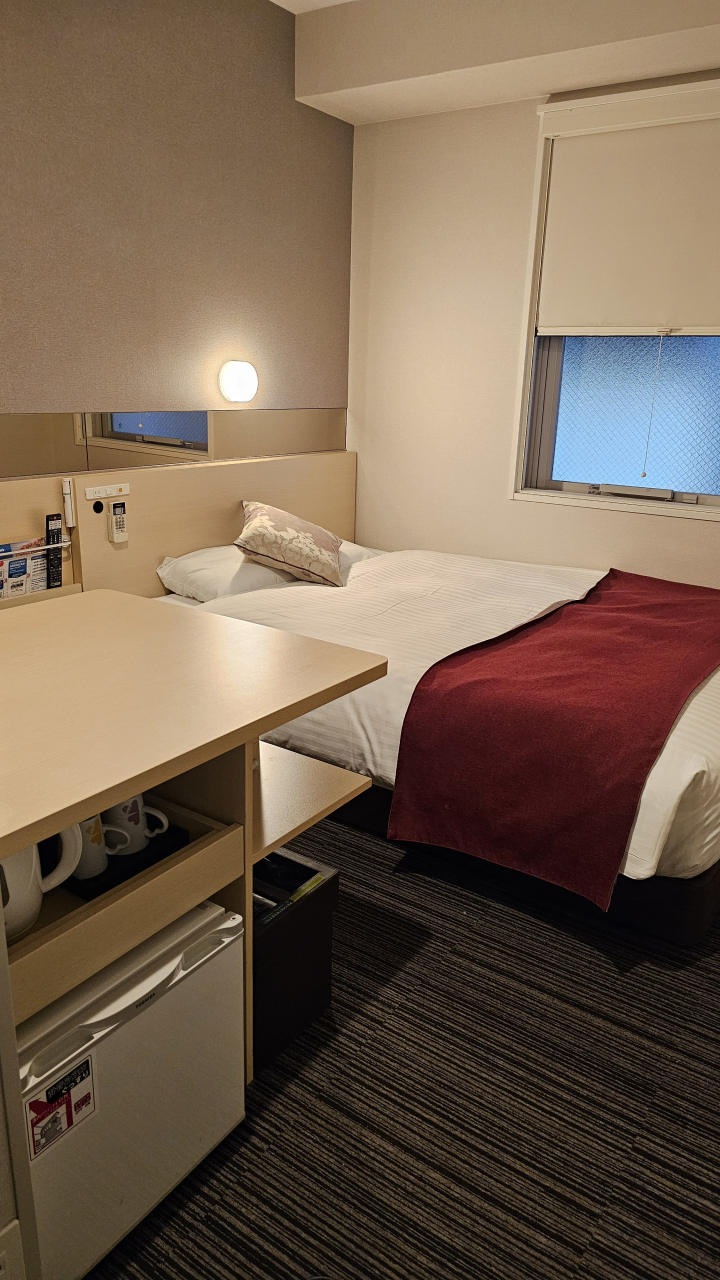 四ツ橋線の本町駅からはすぐの立地ですが、新幹線利用で新大阪から御堂筋線で来たため、たどり着くまでわりと歩きました。部屋はカードキーではなく、暗証番号を入力して開けるという初めてのタイプでしたので、番号を忘れないように携帯で写真を撮っておきました。