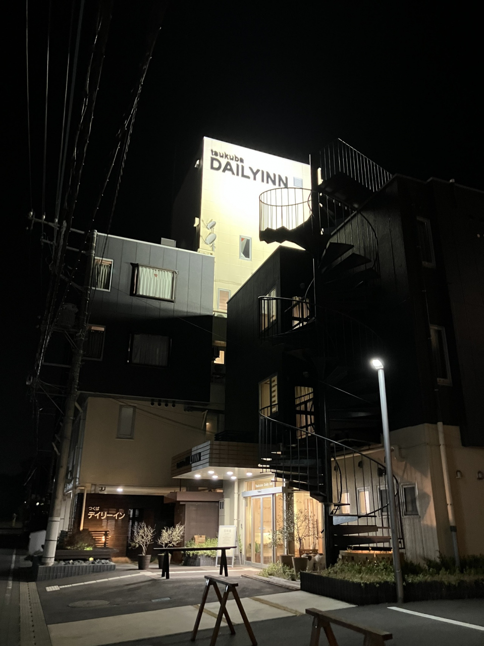 夜のつくばはとても暗いですが、こちらのホテル周辺は特に暗いです。入口は東大通り側ではなく、1本中に入った側ですので、ご注意を。