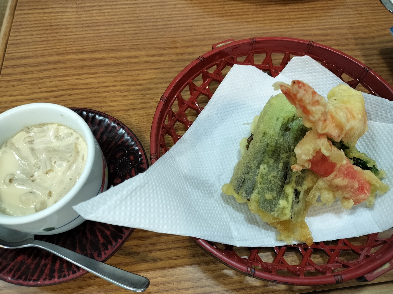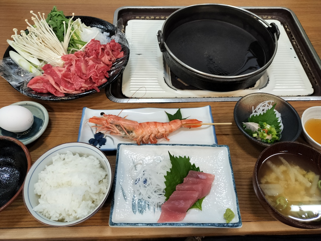 すき焼き、お造り、あん肝(かな?)、その後、アツアツの天ぷらと茶碗蒸し。