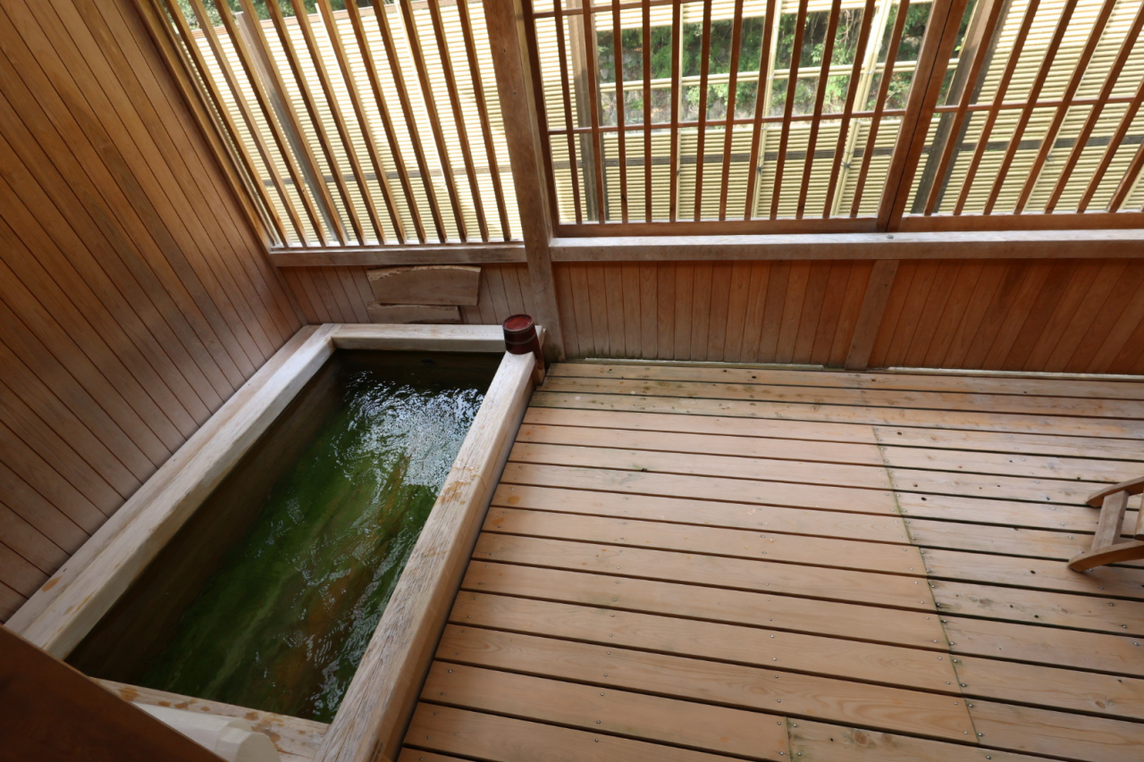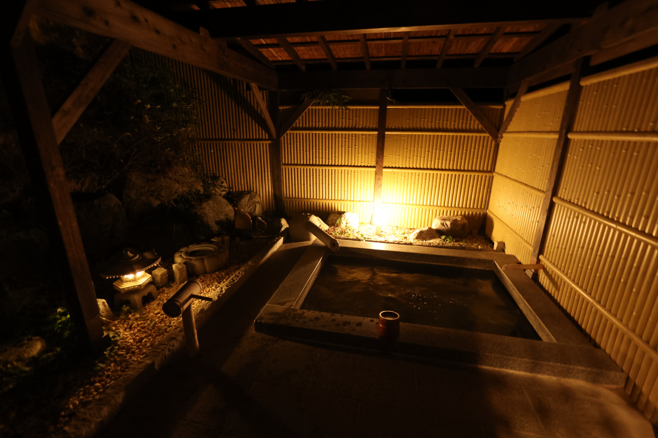 温泉は部屋の他にも露天風呂付き大浴場と、予約不要でいつでも入れる貸切露天風呂があります。前者の内湯はごく普通の雰囲気ですが、露天風呂は川沿いの林の中に佇んでおりなかなか。後者は2つの貸切風呂がありますが雰囲気はどちらに入ってもほぼ同じ。脱衣スペースにはエアコンもしっかり効いており、程よい大きさの湯船でゆっくり湯浴みを楽しめます。