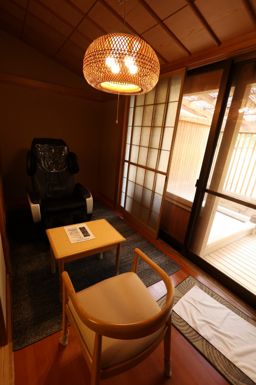 今回宿泊した瀬音の館の部屋は勿論温泉付きで、高級宿らしいゆったりした和室にはマッサージチェアも完備。木造りの半露天風呂の雰囲気も良く、日常を忘れてのんびり寛げます。ただ若干年季が入っているなぁ。と感じるところもあるので近年できたキラキラ系高級温泉宿のつもりで行くとちょっとガッカリするかもしれません。