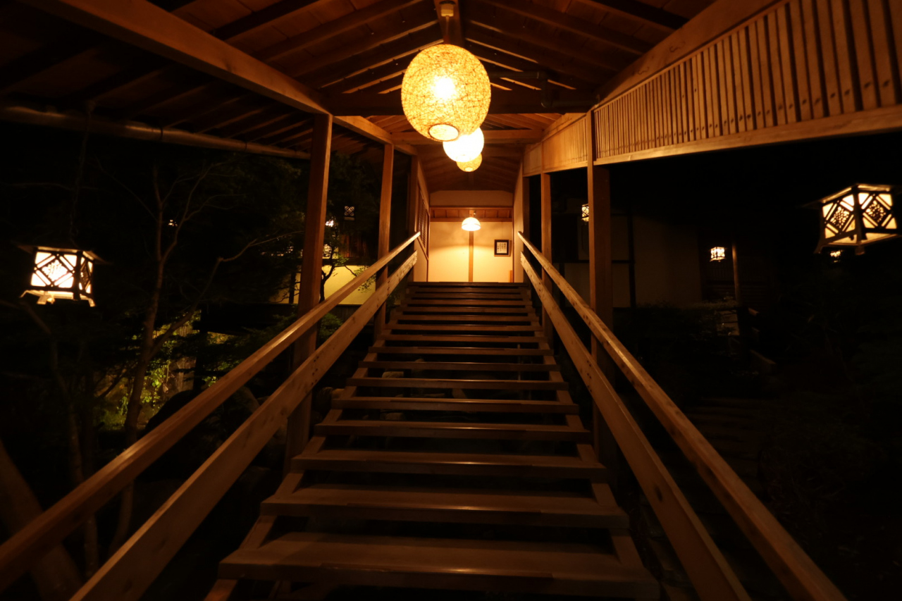 宿は里山の集落から坂道を降りた川沿いの広大な敷地に広がっており、庭や貸切露天風呂、離れの部屋などで贅沢な空間になっています。