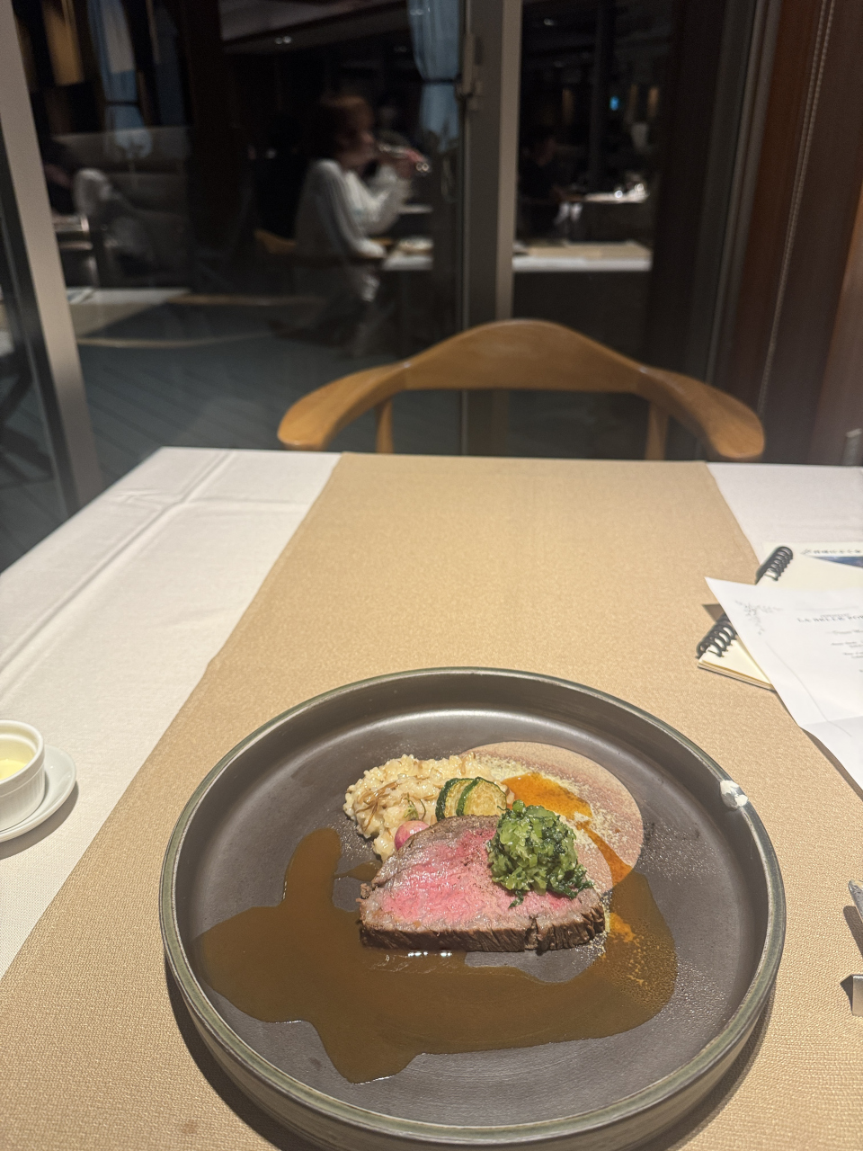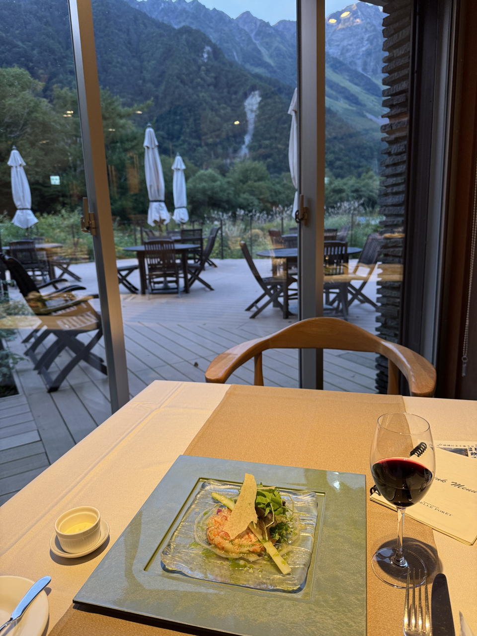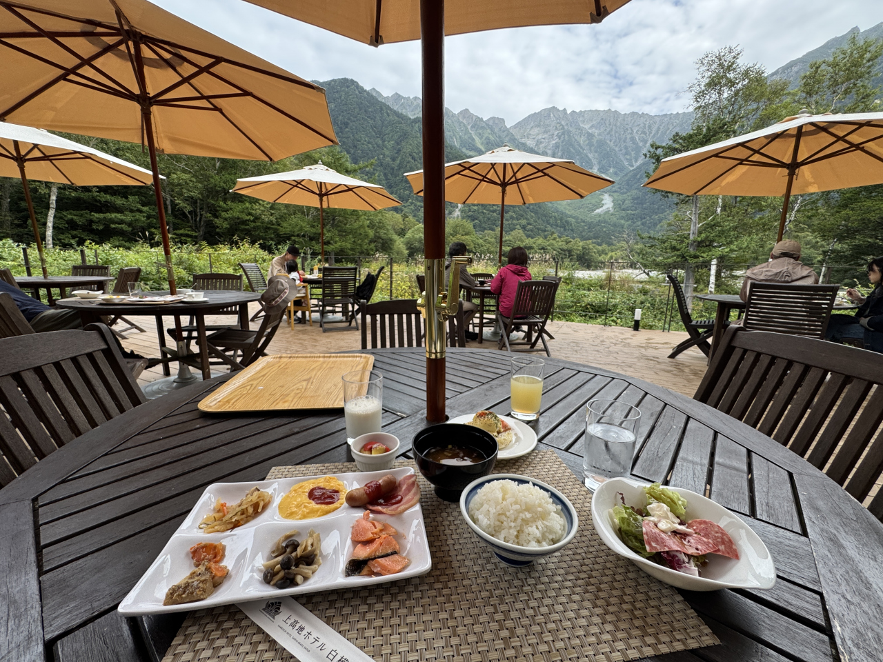 食事は夕食がコース料理、朝食がバイキングでした。夕食はコース料理で牛肉の料理が特に美味しかったです。朝食はテラスかレストランでの食事が選べ、今回は勿論前者を選択。上高地の絶景を愛でながらのモーニングは最高の贅沢でしょう。