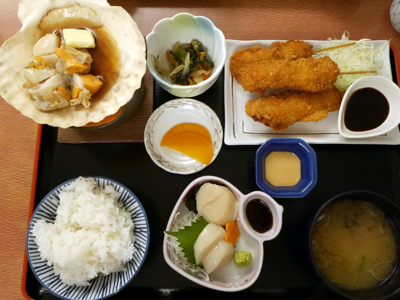 更に、ここはホタテが有名な場所。夕食には併設の食堂でホタテ定食をいただいた。バター焼き、刺身、ベビーホタテフライと全部盛り。
