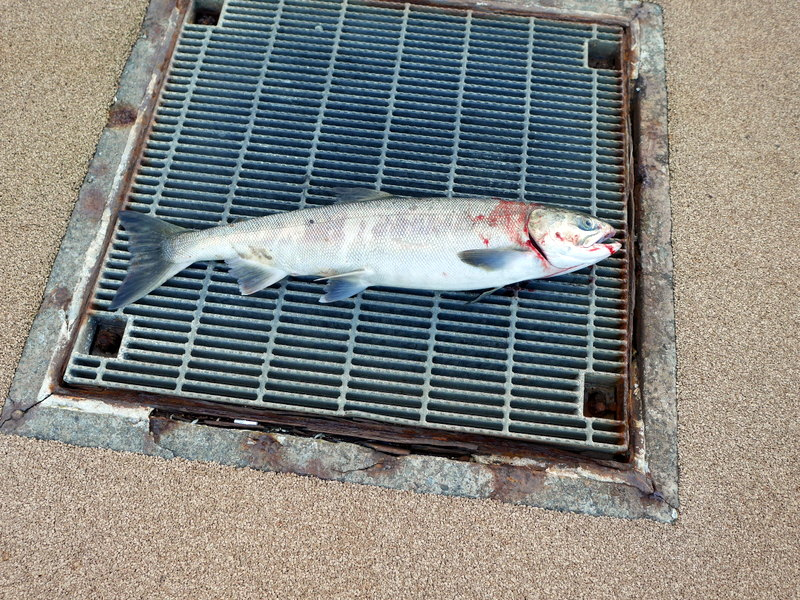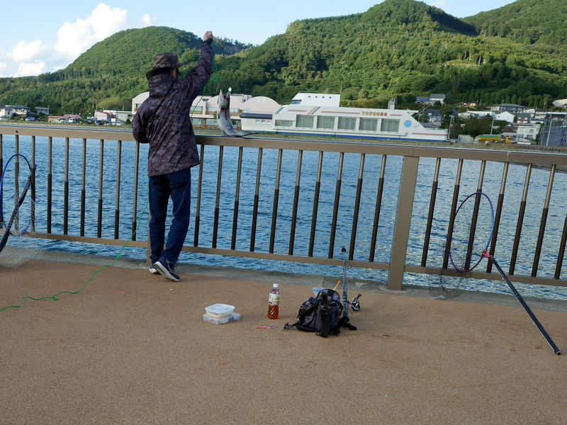 夕方、付近を散歩をしていると防波堤で鮭を釣り上げた方がいた。港を鮭が回遊しているらしく釣り人も多い。翌朝は上流にあるインディアン水車にも立ち寄ってみると、確かにたくさんの遡上する鮭を見物できた。