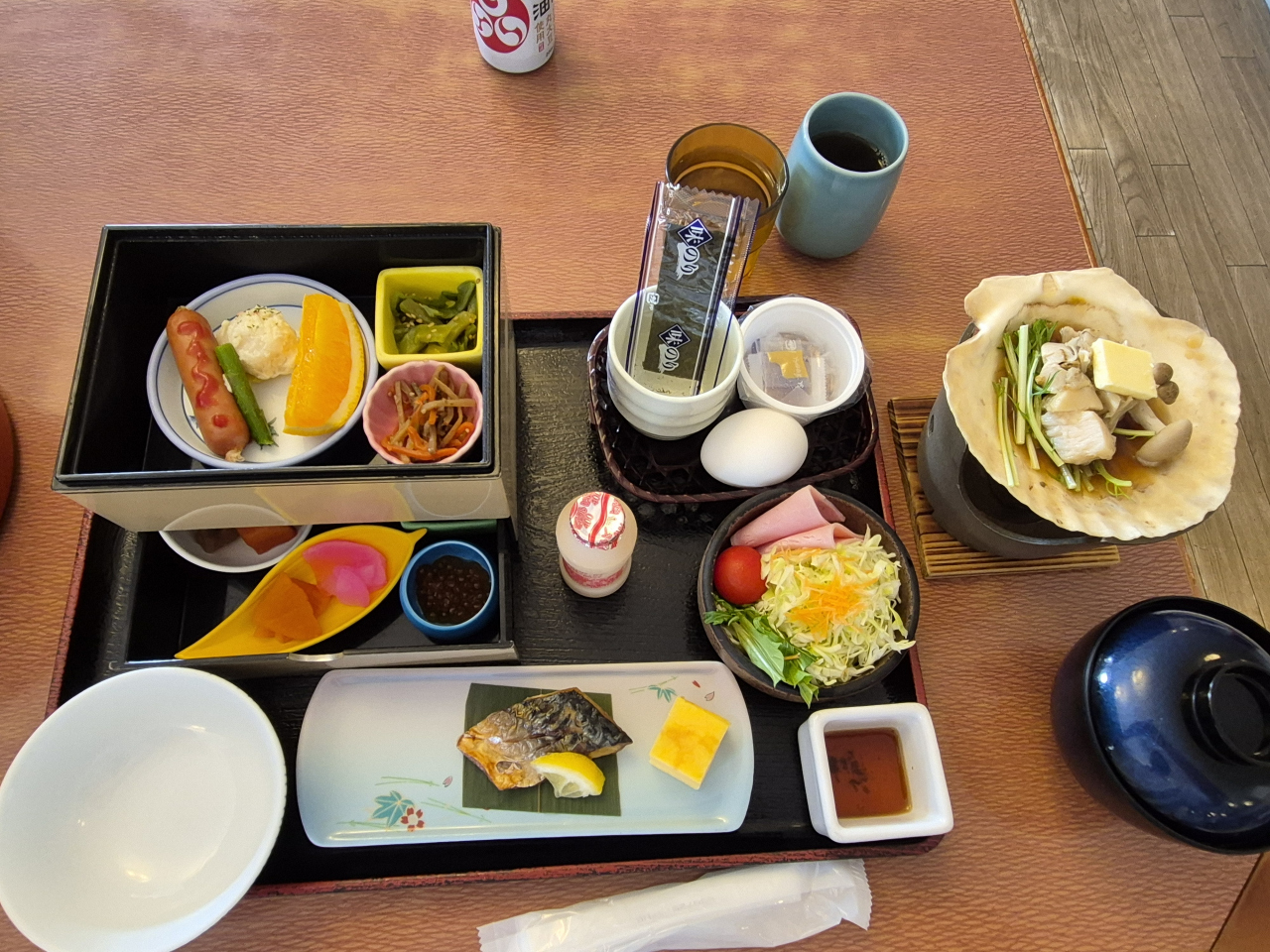 朝食はこのエリアらしく海鮮付きの和食で、ホタテのバター焼きが出ました。