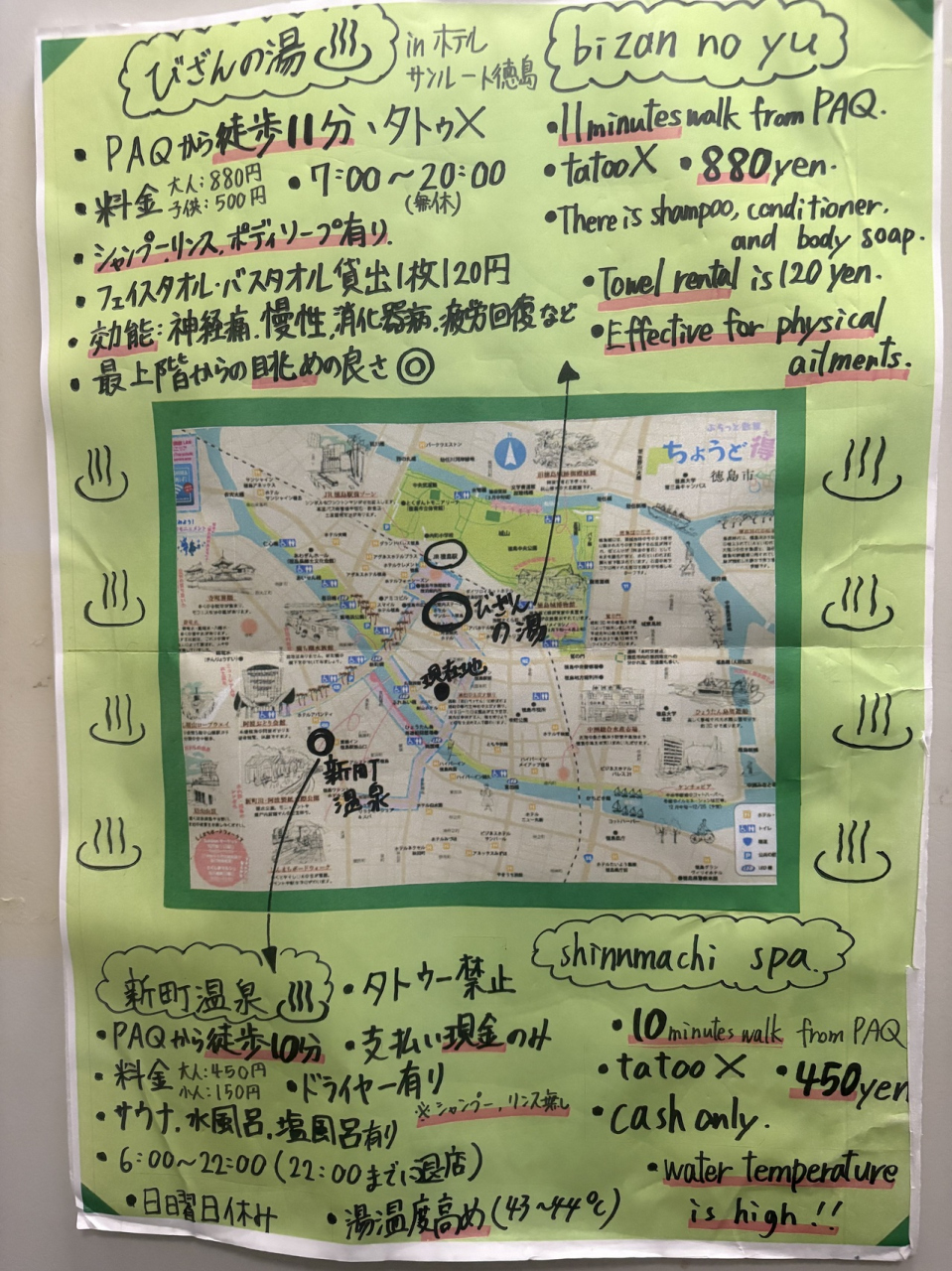 今回は利用しませんでしたが、近くにお風呂入れる場所の紹介も掲示してありました。