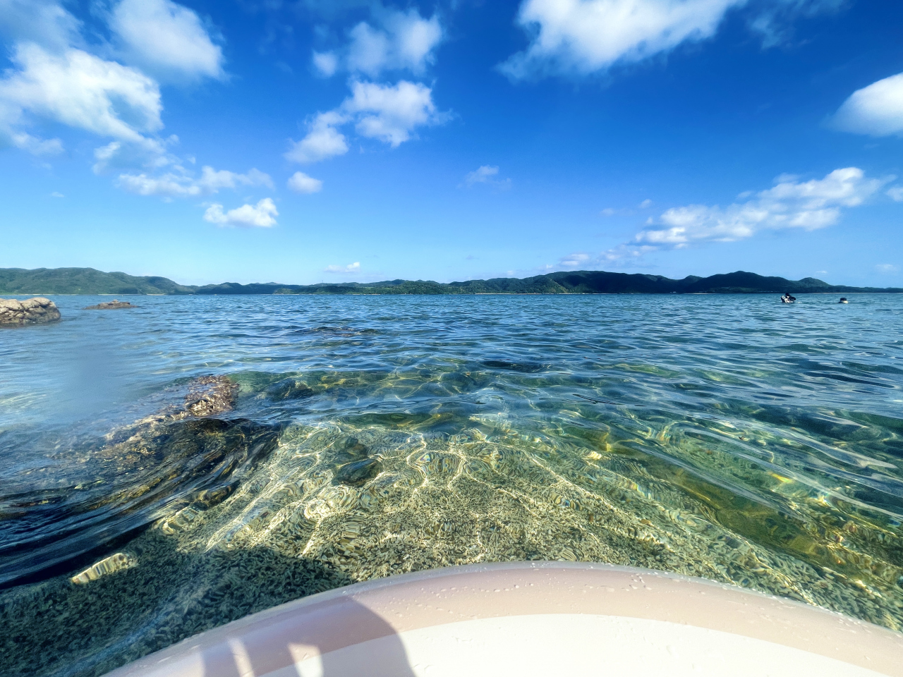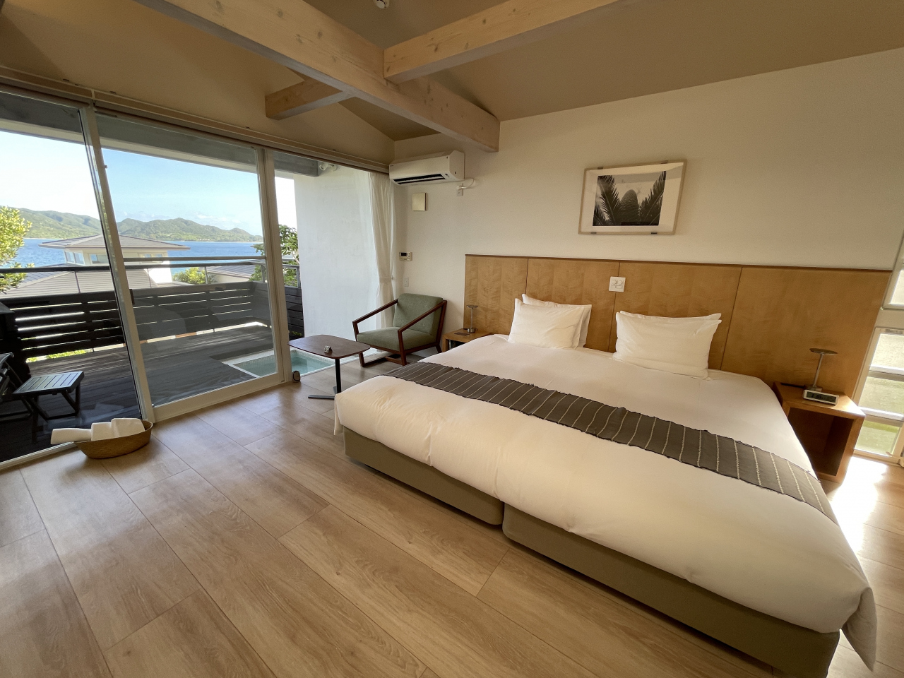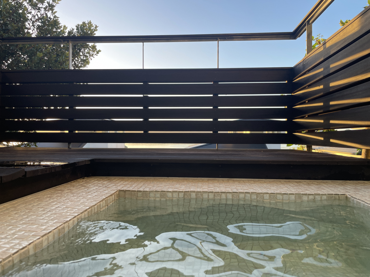 ビーチは石が多いものの、たくさんの小さな魚たちが泳ぐのを見ることができました。また、テラスのアウトドアバスは写真で見るより広く、手足が伸ばせてとても快適でした。夕暮れ、朝焼けを眺めながらの入浴は至福でした。