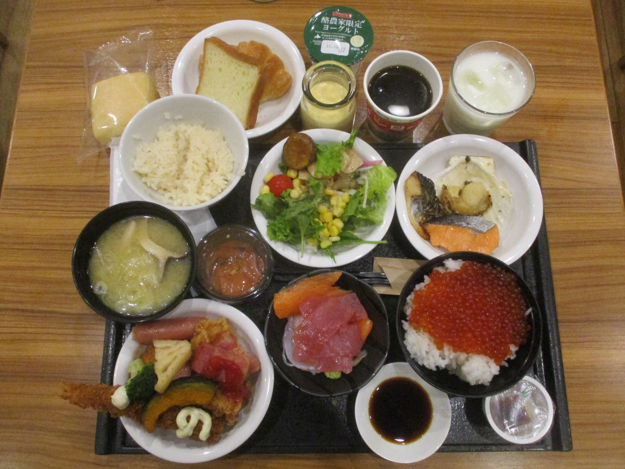 朝食は種類豊富で、北海道産の食を使ったいろいろなメニューがありました。宿泊客が多いので、前日までに利用する時間帯を決めておき密を回避する対策を図っていました。食材を取りに行く際、消毒液を付けることにしたり、ビニルの手袋を付けるなど衛生面に配慮されていました。
