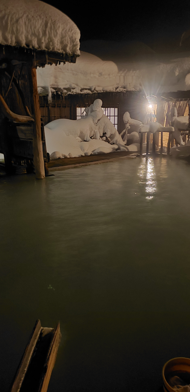 温泉は夜中でも開いています。時差ボケと落雪で午前3時に起きた際、黒湯露天に行ったらもちろん誰もおらず独り占めできました。