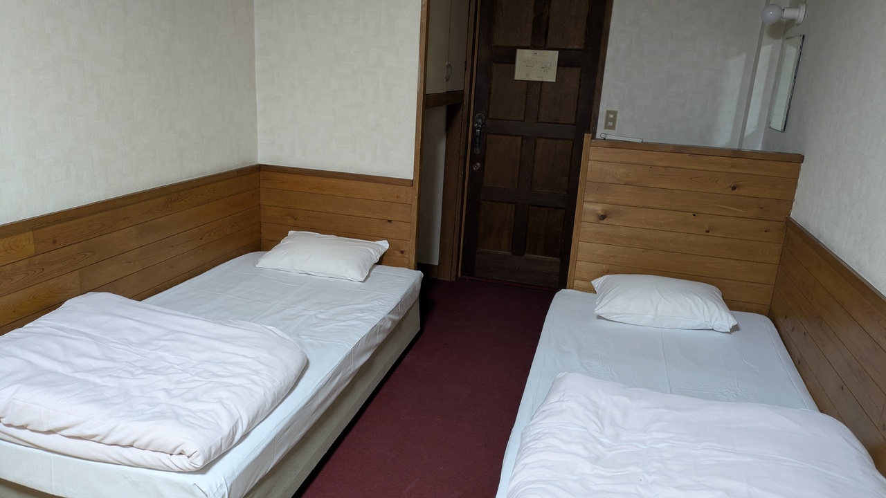 仕事で利用。ベッドが2つ、奥に1段高くなっている畳のスペースがありました。洗面台があり歯ブラシと石けんのみ。トイレ、お風呂は共用です。お風呂はリンスインシャンプーとボディソープ。ドライヤーが一つ。部屋にティッシュがほしかったな。ポットはロビーにだけ。部屋のプラカップを持っていくしかありません。良かった点、お風呂場に1つだけある洗濯機が無料。洗剤もあった。乾燥機は100円
