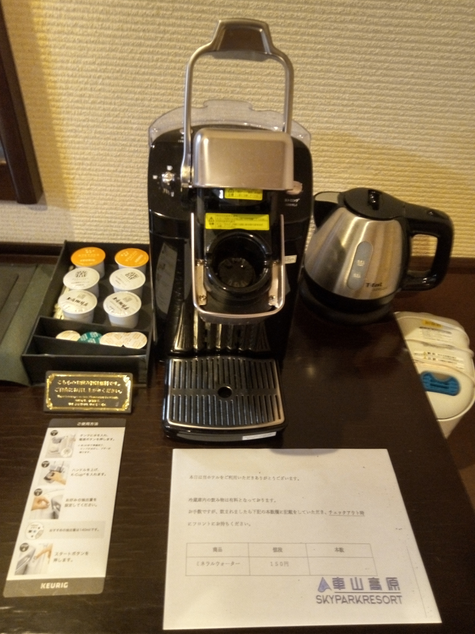 「和洋室【F棟最上階】40平米」は、プロミネント棟3階にあって、窓側が6畳敷きになっていて、広くて綺麗ですが、ゴミや髪の毛が落ちていました。霧で山々は見えませんでしたが、夜は白樺湖の明かりが見えました。3種類のコーヒーが飲めるのが嬉しいです。お風呂は、ジェット付きの内湯、(眺めが良い)露天風呂があって、温泉ではありませんが、「天狗水」が使われているそうです。夕・朝食バイキングは、種類もまあまあで、美味しかったですが、旅行サイトのプランにあった「酢めしにこだわったにぎり寿司、ちらし寿司や巻寿司」はありませんでした。14時半に着いたら、「手続きは15時から」と言われ、ロビーで待っていたら、15時直前に着いた人から手続きされそうになりました。